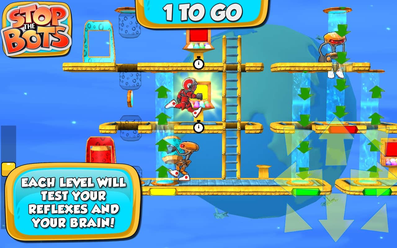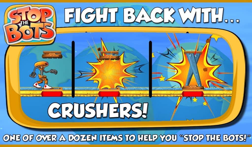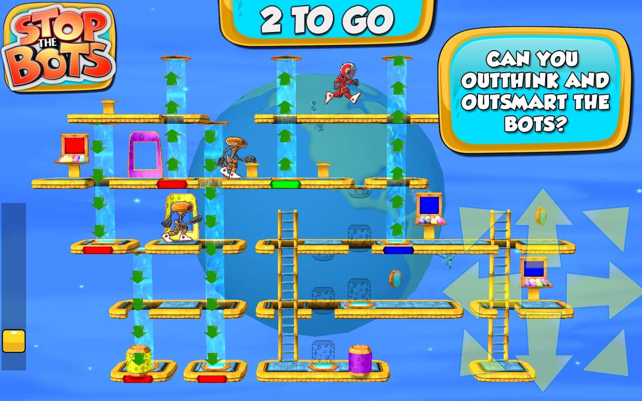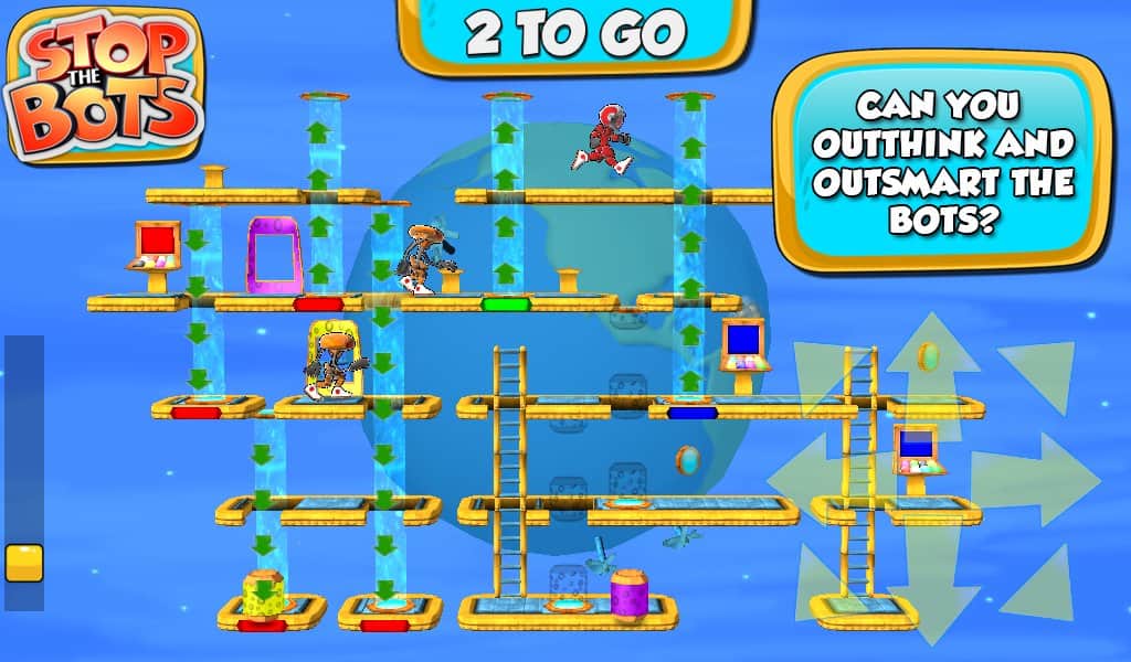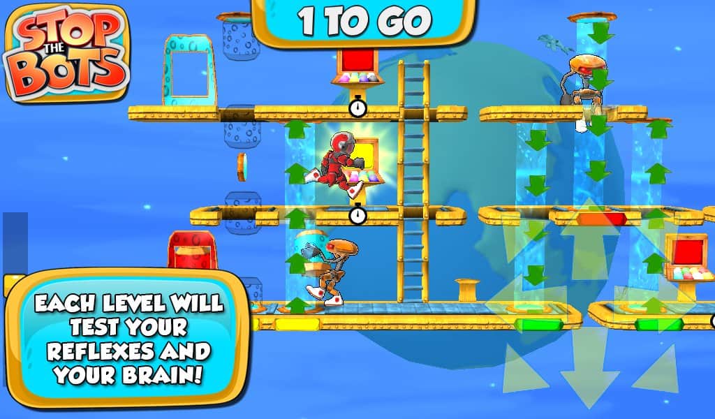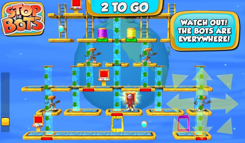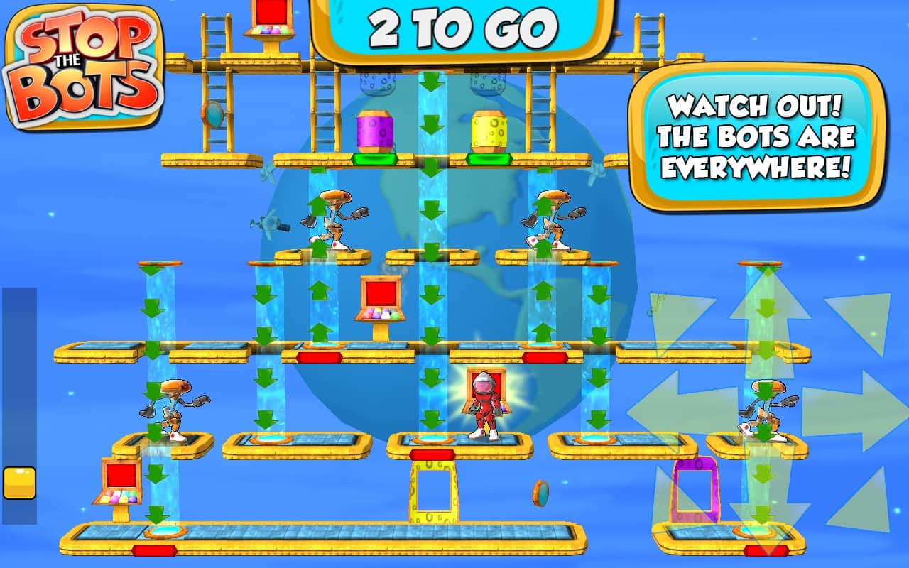 Botları Durdurun - uzaylı robotun gemisini devre dışı bırakmanız gereken bir bulmaca oyunudur, böylece Dünya'ya saldırmasın. Farklı seviyelerde dolaşın ve robotun peşinizden gelmeden önce ihtiyaç duyduğunuz parçaları ondan daha hızlı toplayın. Oyun, 90 seviyede engellerden kaçınarak ve robotla karşılaşmaktan kaçınarak bulmaca ile arcade aksiyonunu birleştiriyor.