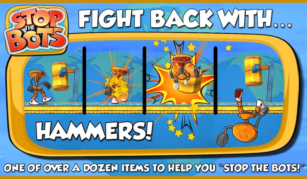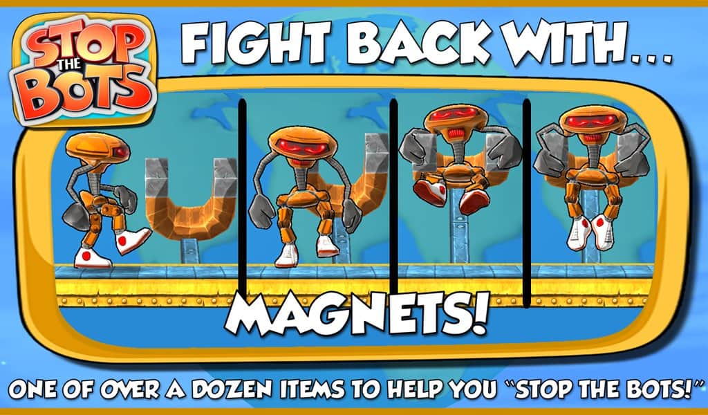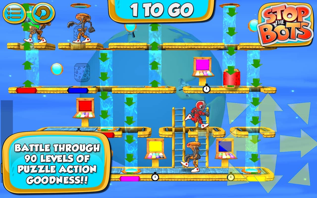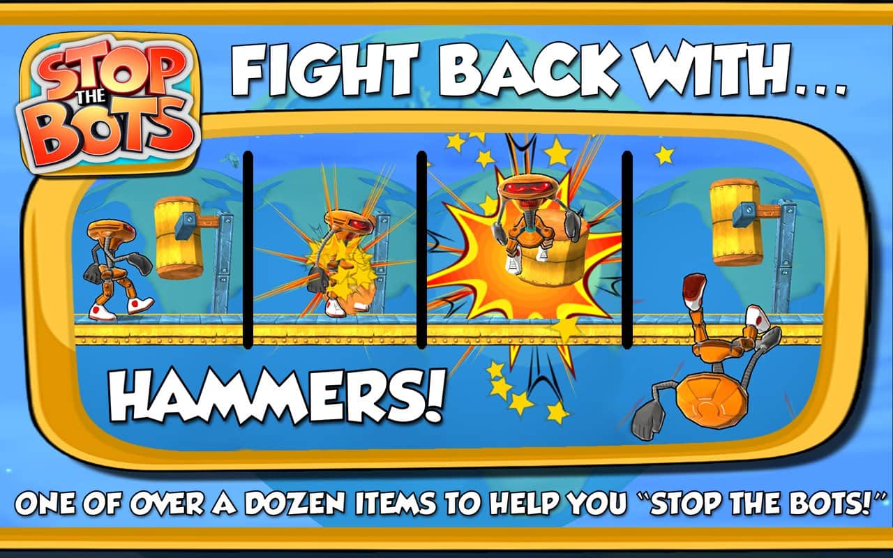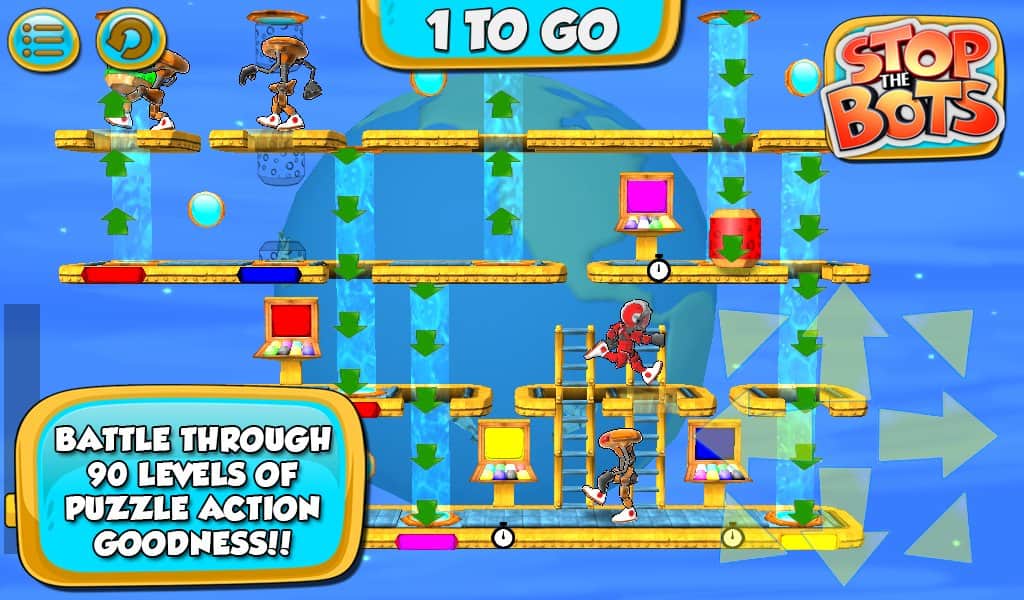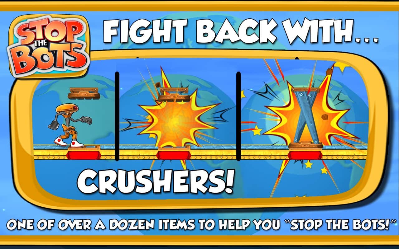 Botları Durdurun - uzaylı robotun gemisini devre dışı bırakmanız gereken bir bulmaca oyunudur, böylece Dünya'ya saldırmasın. Farklı seviyelerde dolaşın ve robotun peşinizden gelmeden önce ihtiyaç duyduğunuz parçaları ondan daha hızlı toplayın. Oyun, 90 seviyede engellerden kaçınarak ve robotla karşılaşmaktan kaçınarak bulmaca ile arcade aksiyonunu birleştiriyor.
