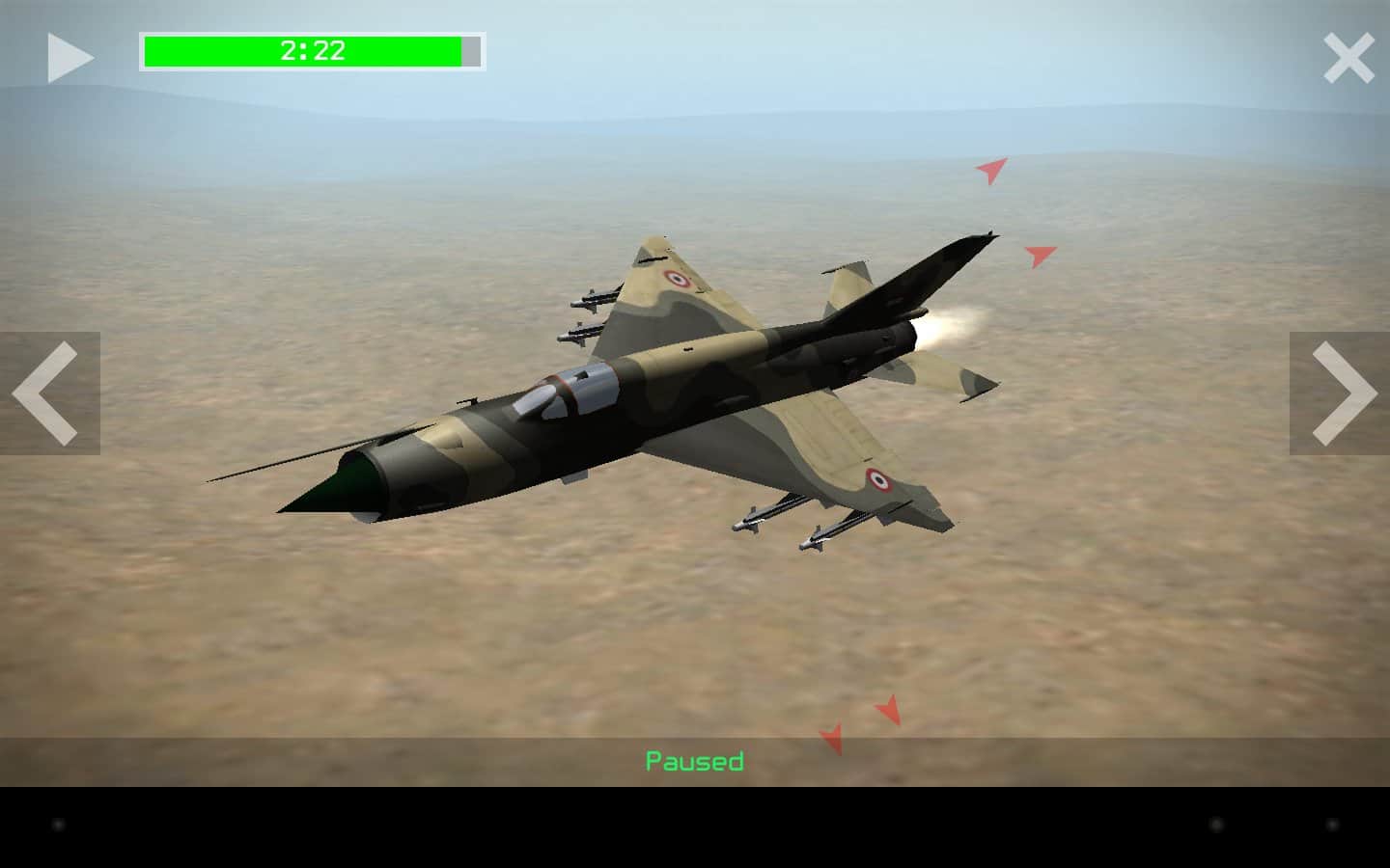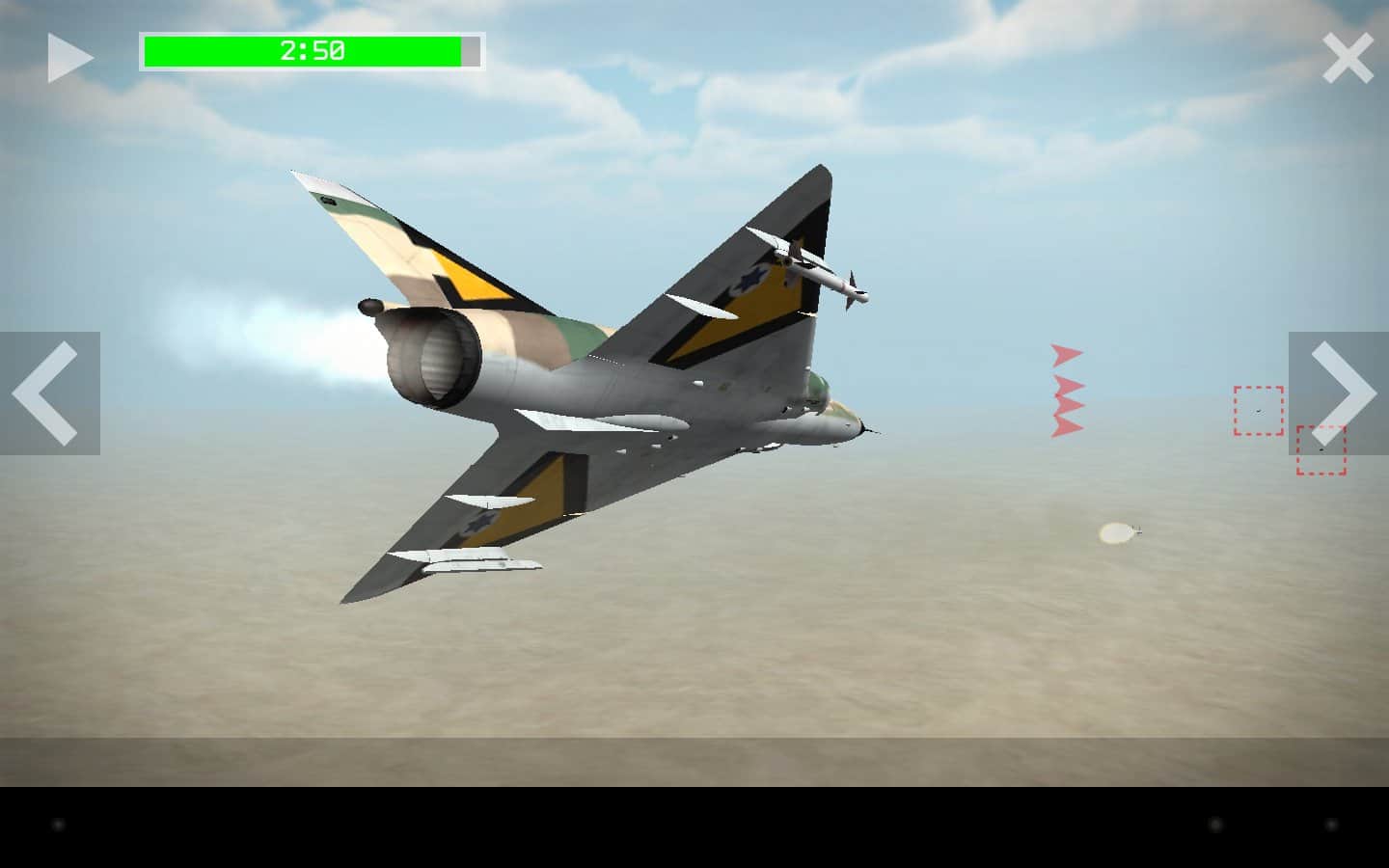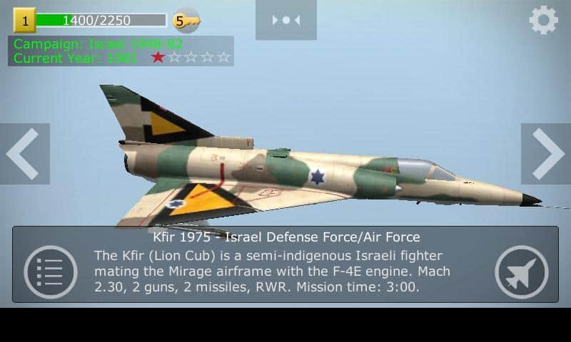 İsrail Savaş Uçakları - Android için dinamik bir 3D uçuş oyunu, geniş bir uçak seçeneği ile. Sizi İsrail üzerinde hava savaşları bekliyor. Oyunda kontrol, ivmeölçer aracılığıyla sağlanıyor. Kampanya, 1948'den 1982'ye kadar Orta Doğu savaşlarını kapsıyor. Sonucunuzu Google+ hesabınızla birlikte kaydedebilirsiniz.