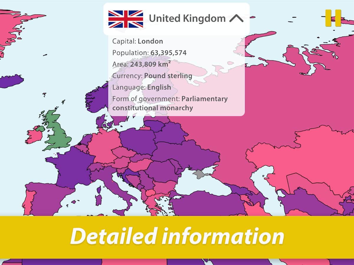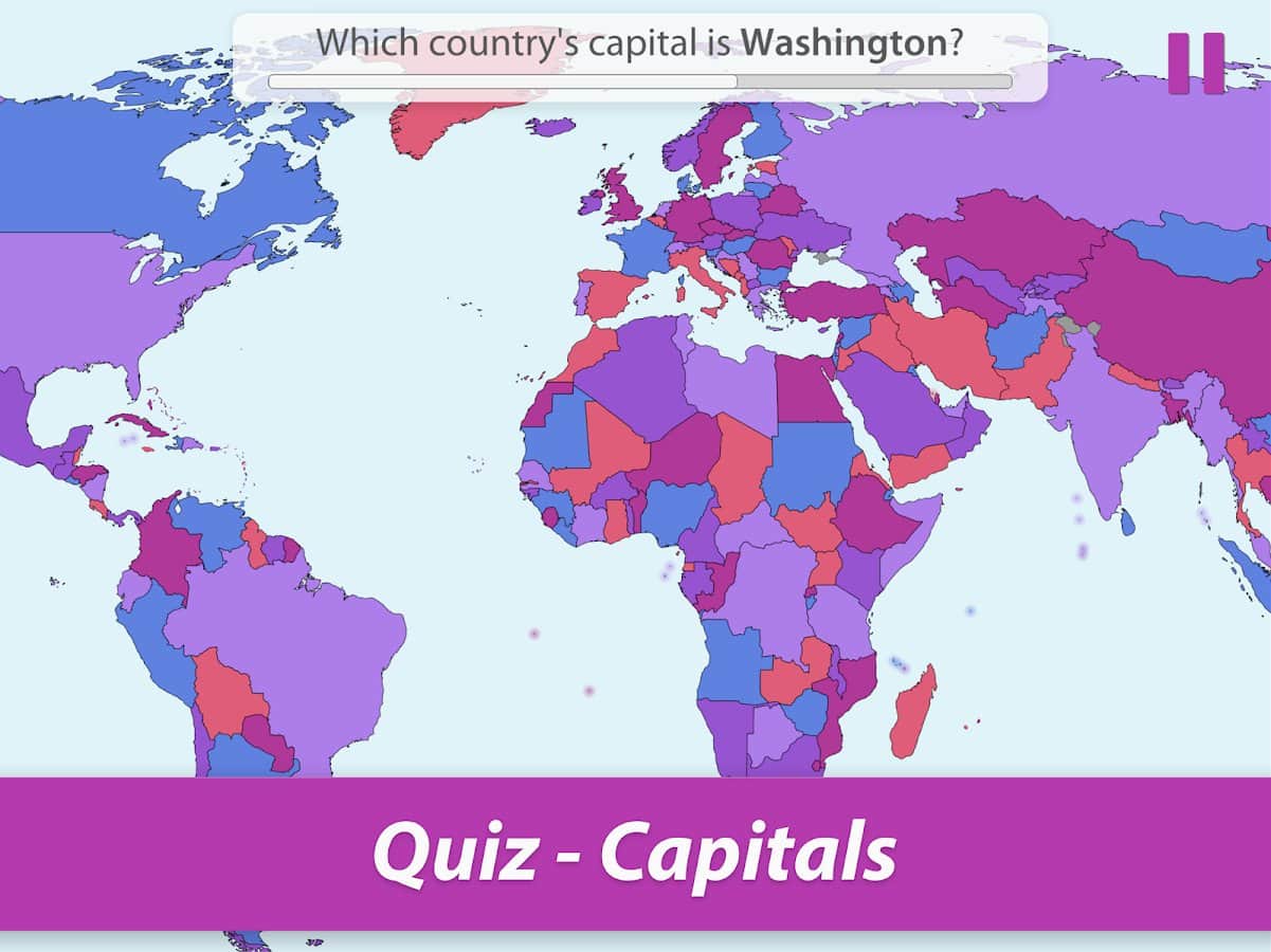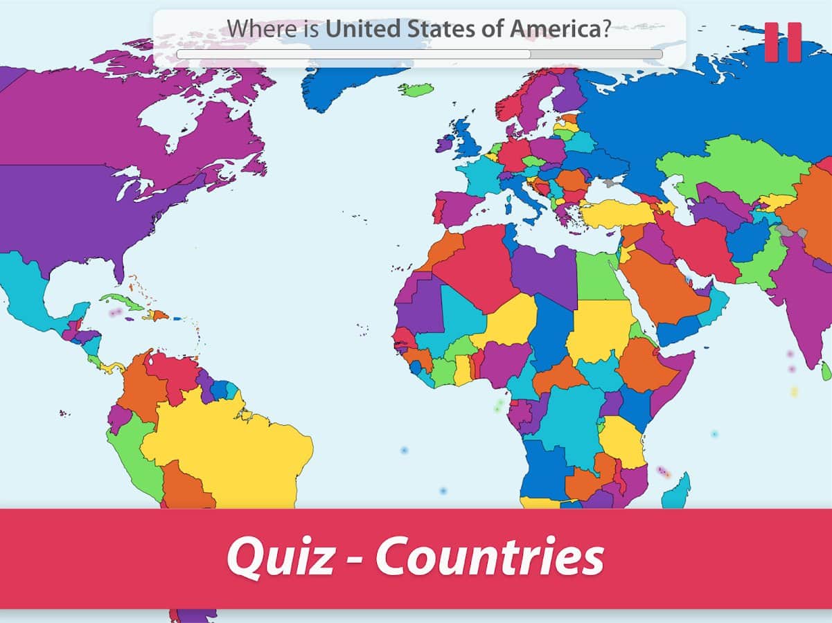 Hafızanızı geliştirmek ve aynı zamanda gezegendeki tüm ülkeleri bilmek ister misiniz? Zamanla eğlenceli bilgi yarışmaları ile Dünya'yı keşfedin ve her bölge hakkında en önemli bilgileri öğrenin: konum, bayrak, başkent, nüfus, alan, para birimi, dil ve yönetim şekli. Bu bilgiler kesinlikle bir gün herkes için faydalı olacaktır, coğrafyayı sevmeseniz bile. Oyun hem çocuklar hem de yetişkinler için uygundur, her ne kadar süreç eğlenceli bir oyun gibi görünse de. Tüm modları deneyin ve en sevdiklerinizi seçin!