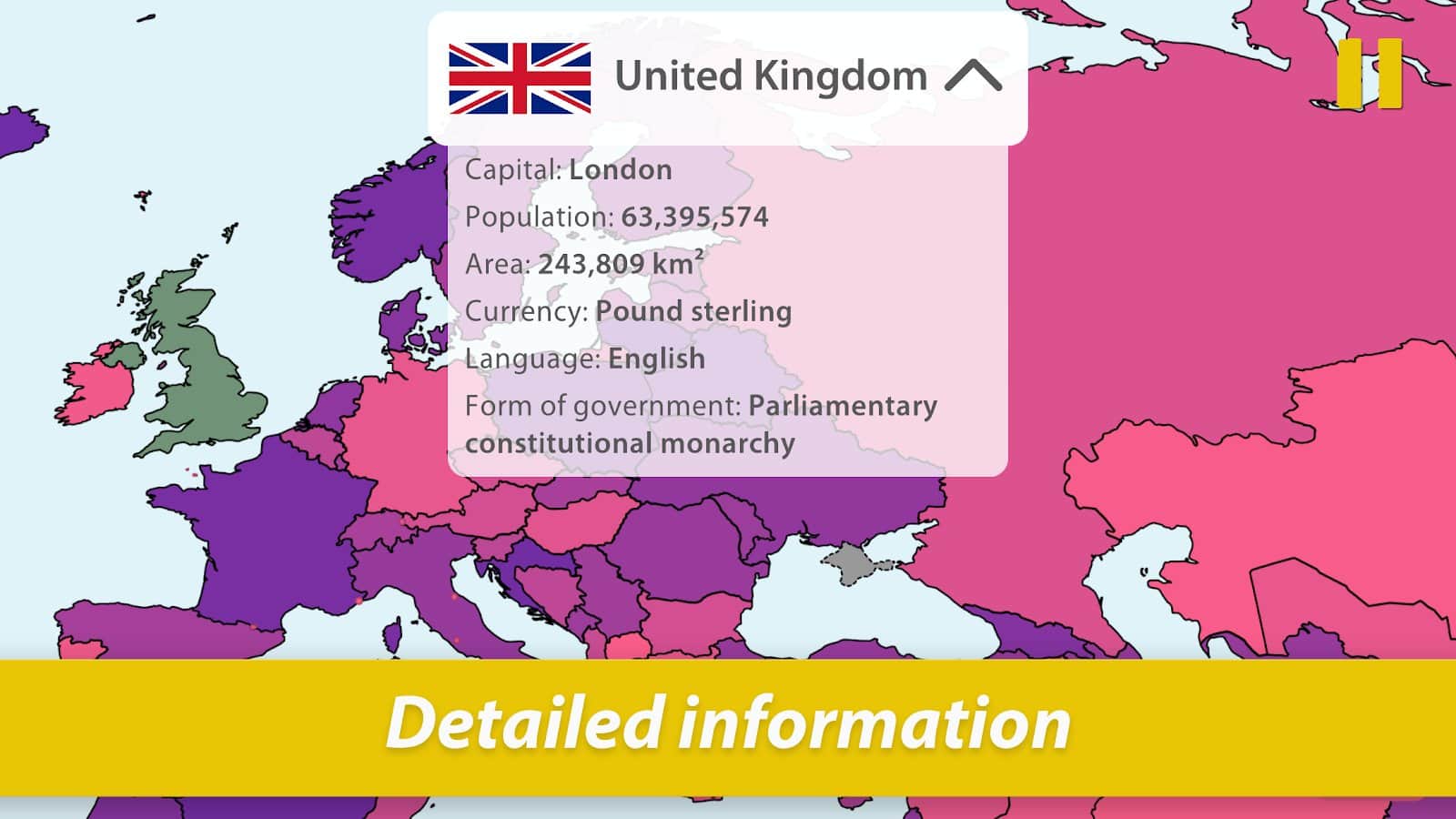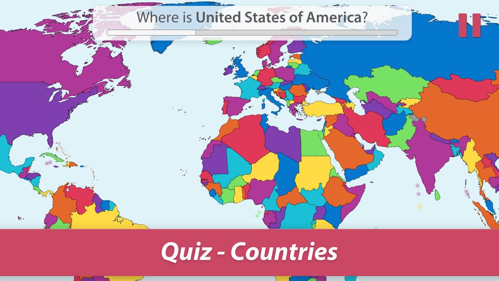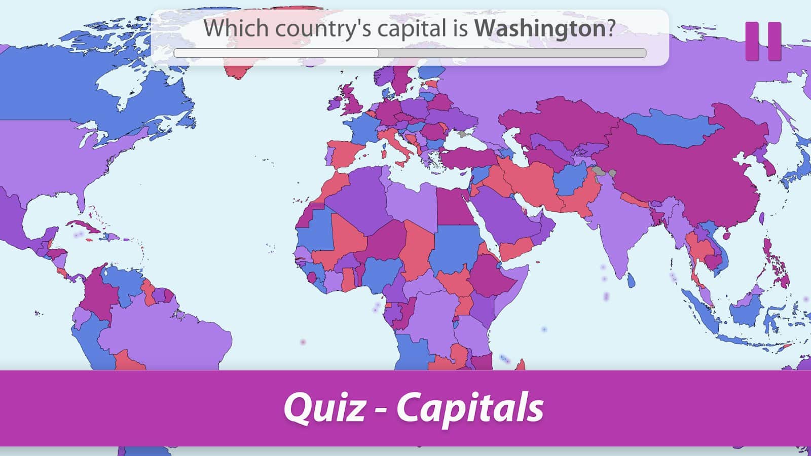 Hafızanızı geliştirmek ve aynı zamanda gezegendeki tüm ülkeleri bilmek ister misiniz? Zamanla eğlenceli bilgi yarışmaları ile Dünya'yı keşfedin ve her bölge hakkında en önemli bilgileri öğrenin: konum, bayrak, başkent, nüfus, alan, para birimi, dil ve yönetim şekli. Bu bilgiler kesinlikle bir gün herkes için faydalı olacaktır, coğrafyayı sevmeseniz bile. Oyun hem çocuklar hem de yetişkinler için uygundur, her ne kadar süreç eğlenceli bir oyun gibi görünse de. Tüm modları deneyin ve en sevdiklerinizi seçin!