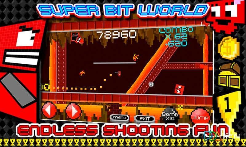 Super Bit World 2D Platformer - Android için bir oyun, farklı seviyelerde koşacak ve düşmanları öldüreceksiniz. Koşun ve ekstra seviyeleri açmak için paraları toplayın, ayrıca kombo vuruşunuzu artırmak için düşmanları öldürün.