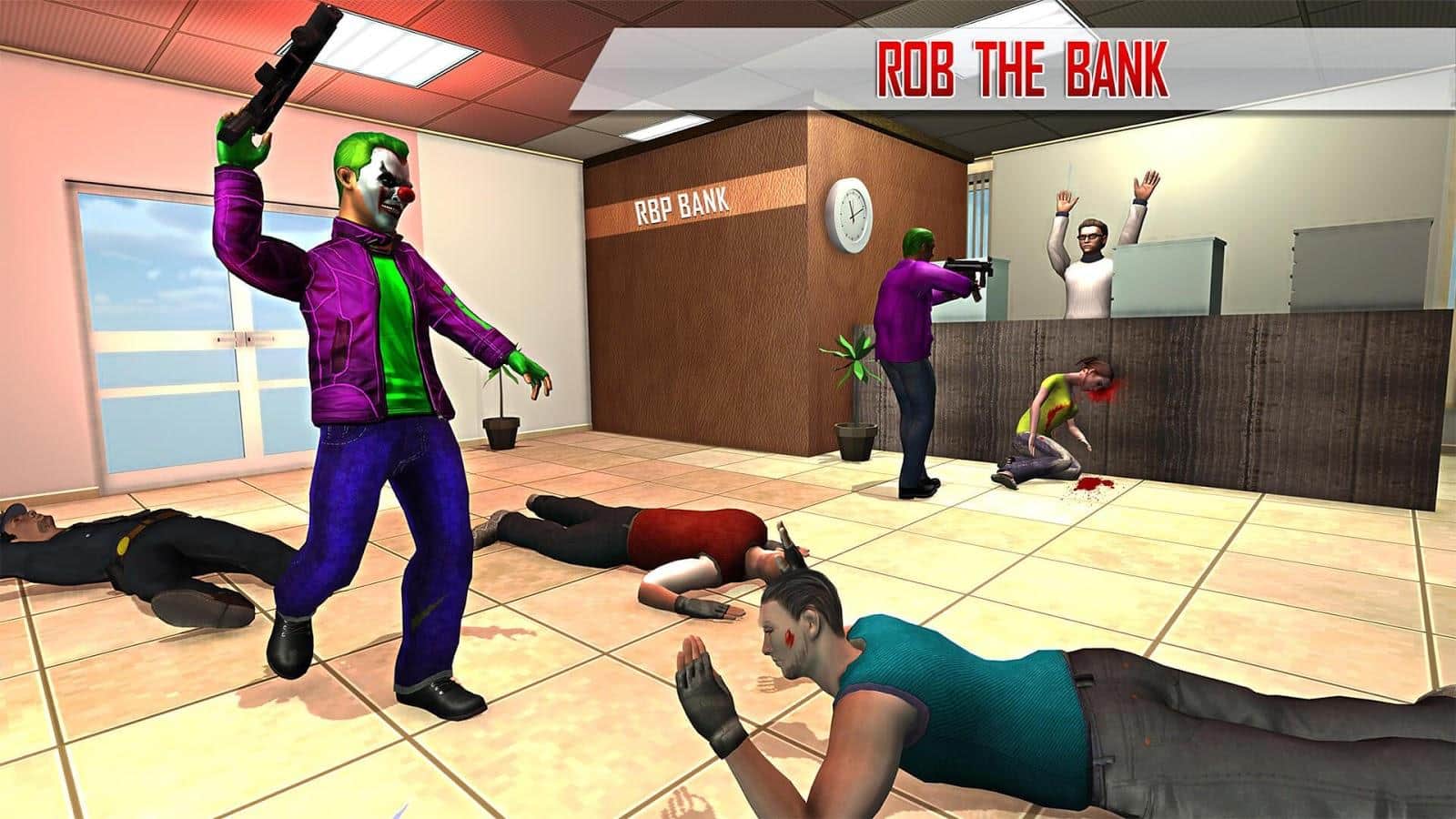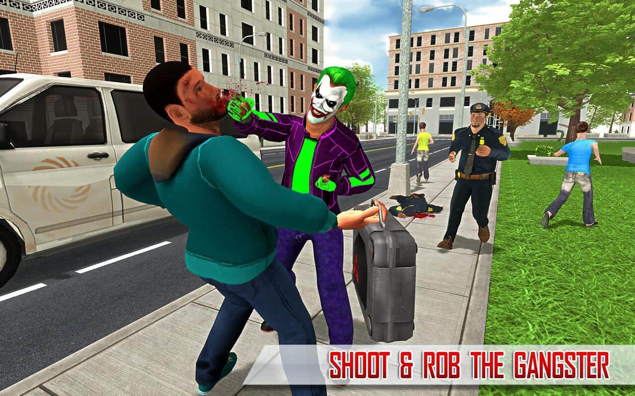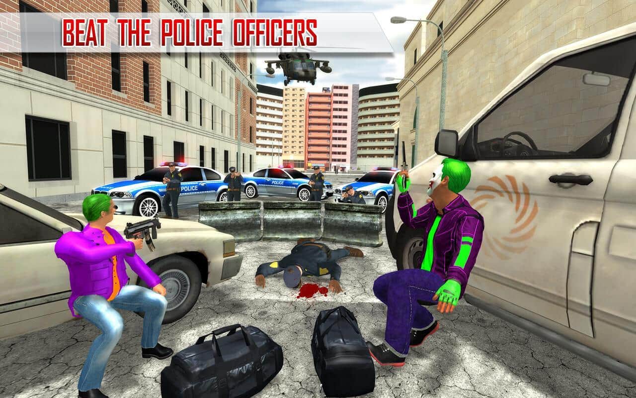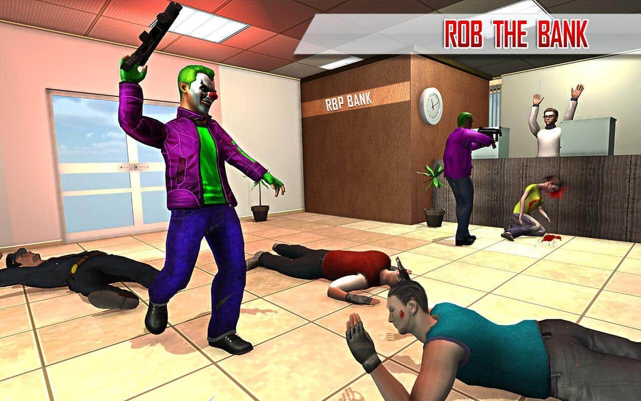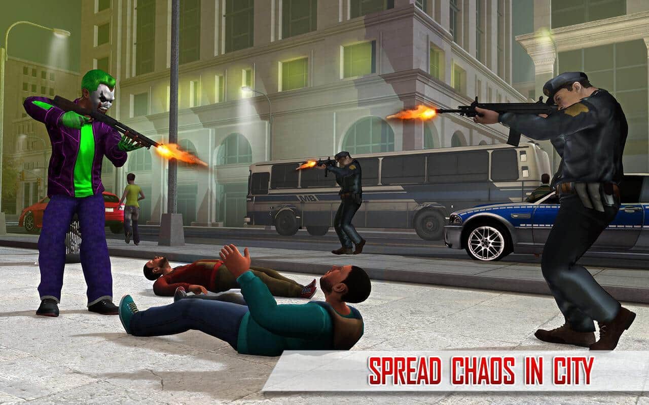 Süper Kahraman Palyaço Kaçışı 2017 – Android için heyecan verici bir aksiyon oyunu, burada deli bir palyaçoyu yöneteceksiniz. Kahramanımız, çocukları eğlendirme yeteneğine sahip sıradışı bir neşeli palyaçodur; bankaları soymak, insanlara saldırmak ve polisle kitlesel çatışmalara katılmak için yaratılmıştır. Bu oyunda, palyaço kostümleri giyen bir grup gangsteri kontrol edeceksiniz ve masum şehir sakinlerine saldıracak, bankaları ve mücevher dükkanlarını soygun yapacaksınız. Bu oyun, oyuncuları gerçekçi 3D grafikleri, çok sayıda silah seçeneği ve çeşitli görevlerle mutlu edecektir.