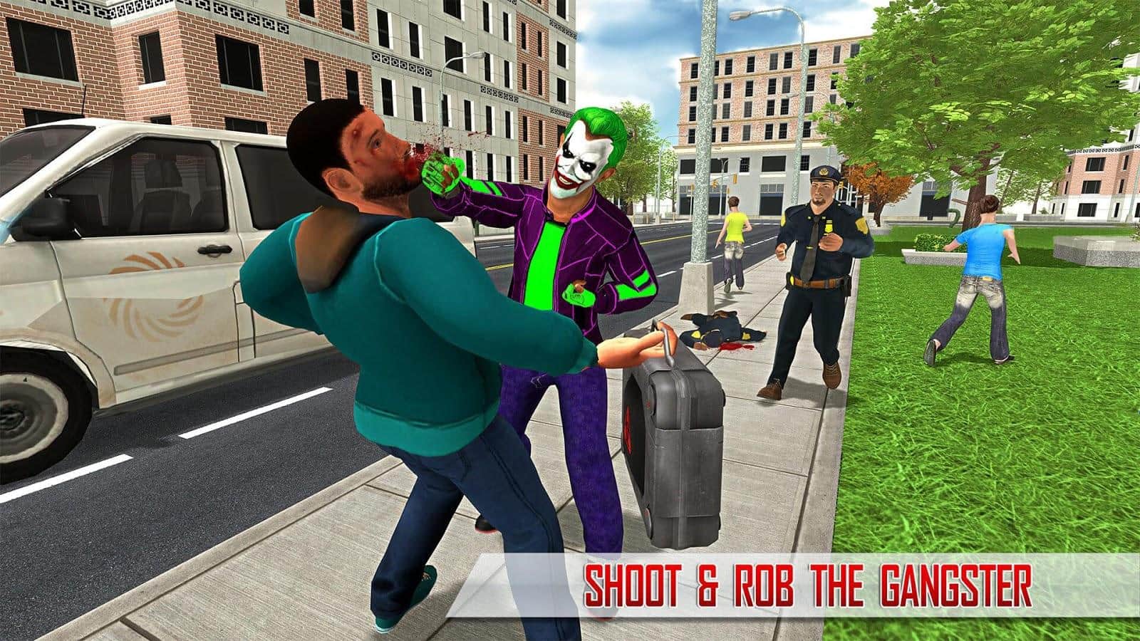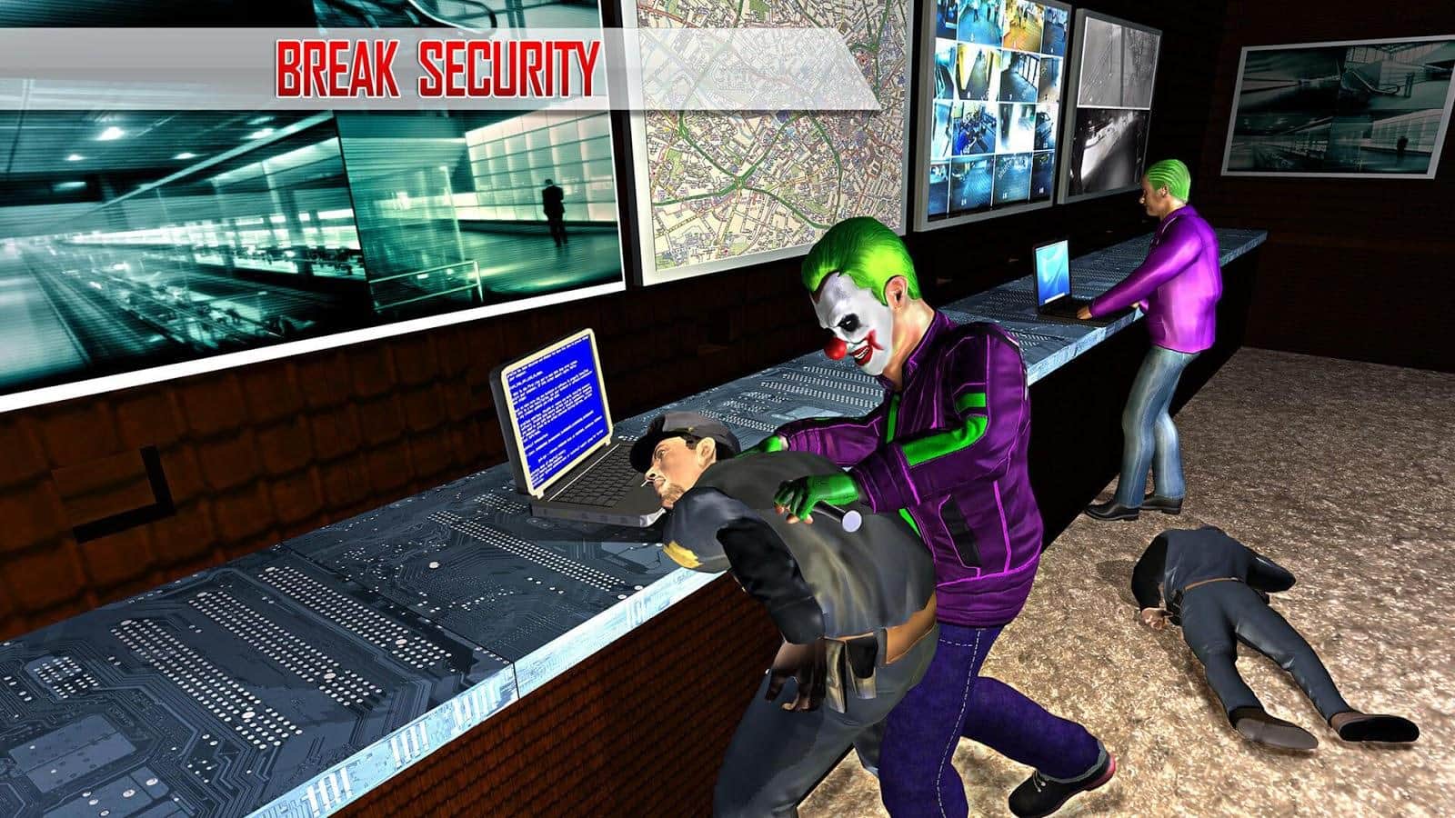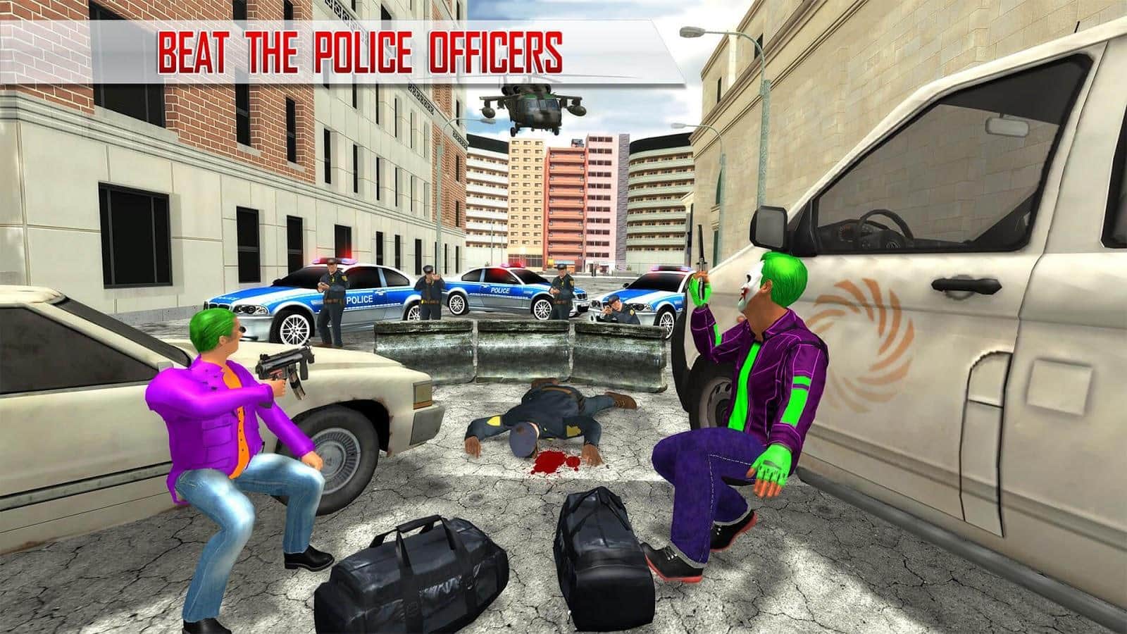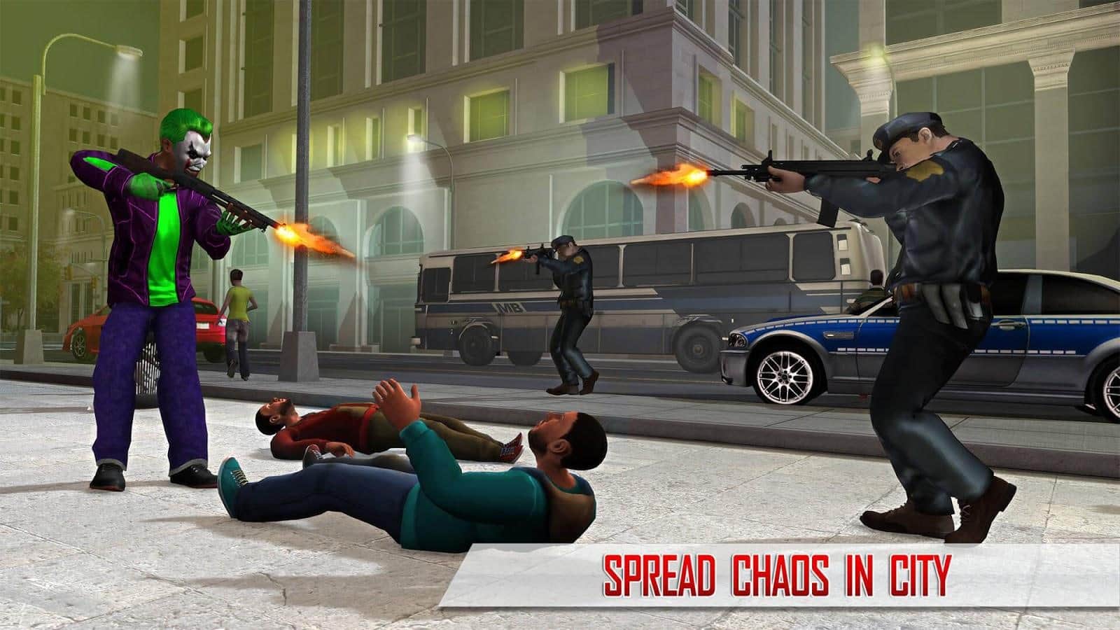 Süper Kahraman Palyaço Kaçışı 2017 – Android için heyecan verici bir aksiyon oyunu, burada deli bir palyaçoyu yöneteceksiniz. Kahramanımız, çocukları eğlendirme yeteneğine sahip sıradışı bir neşeli palyaçodur; bankaları soymak, insanlara saldırmak ve polisle kitlesel çatışmalara katılmak için yaratılmıştır. Bu oyunda, palyaço kostümleri giyen bir grup gangsteri kontrol edeceksiniz ve masum şehir sakinlerine saldıracak, bankaları ve mücevher dükkanlarını soygun yapacaksınız. Bu oyun, oyuncuları gerçekçi 3D grafikleri, çok sayıda silah seçeneği ve çeşitli görevlerle mutlu edecektir.