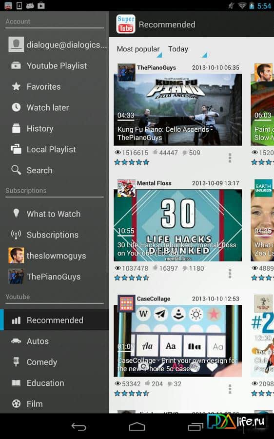 SuperTube - android için sevdikleriniz videoları izlemek üzere tasarlanmış kullanışlı bir youtube oynatıcısı. Program, yeni başlayanların bile anlayabileceği basit ve şık bir arayüze sahiptir. Standart fonksiyonların yanı sıra, uygulamanın kullanımını keyifli hale getirecek başka yararlı özellikler de bulunmaktadır: ileri sarma, duraklatma ve diğerleri.