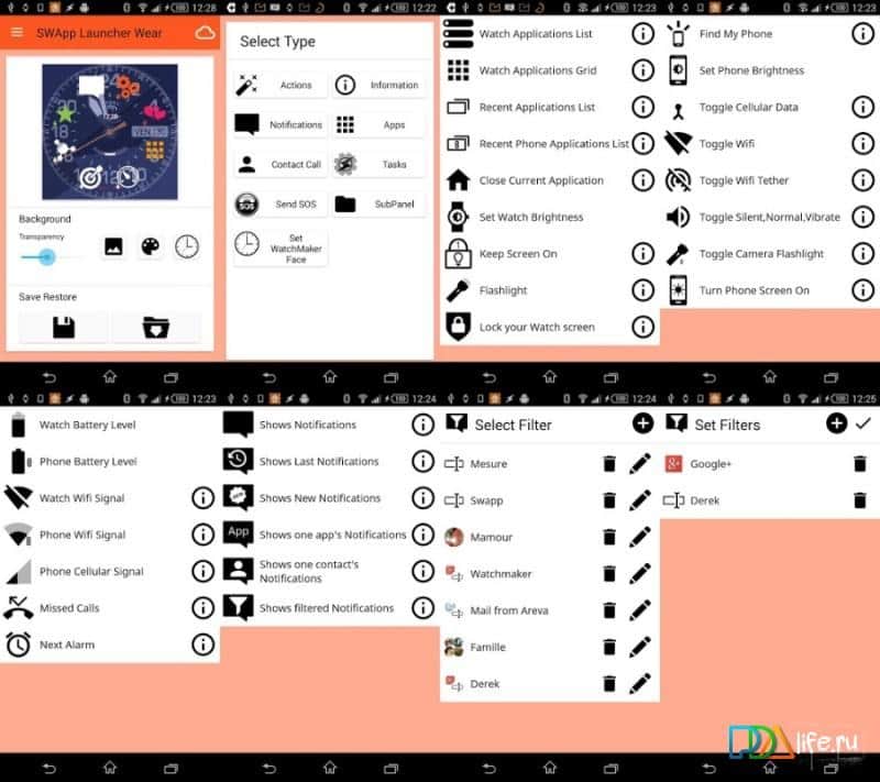 Android Wear için başlatıcı, işletim sisteminin temel işlevselliğini genişletir. Birkaç standart dışı saat kadranından birini seçmenize, saat ekranını kilitlemenize, uygulamaları başlatmanıza, yüklü programların listesini görüntülemenize ve en son başlatılan uygulamaları hem saatten hem de telefondan görmenize olanak tanır. Dahili bir el feneri vardır (saat ekranı tamamen beyaz ışıkla aydınlatılır). Ayrıca hızlı bir şekilde SOS mesajı göndermenin imkanı da vardır. Saatten telefon ayarlarını yönetmek de bir o kadar ilginçtir: hızlı ayarları değiştirme, FindMyPhone, ekranı açma vb.