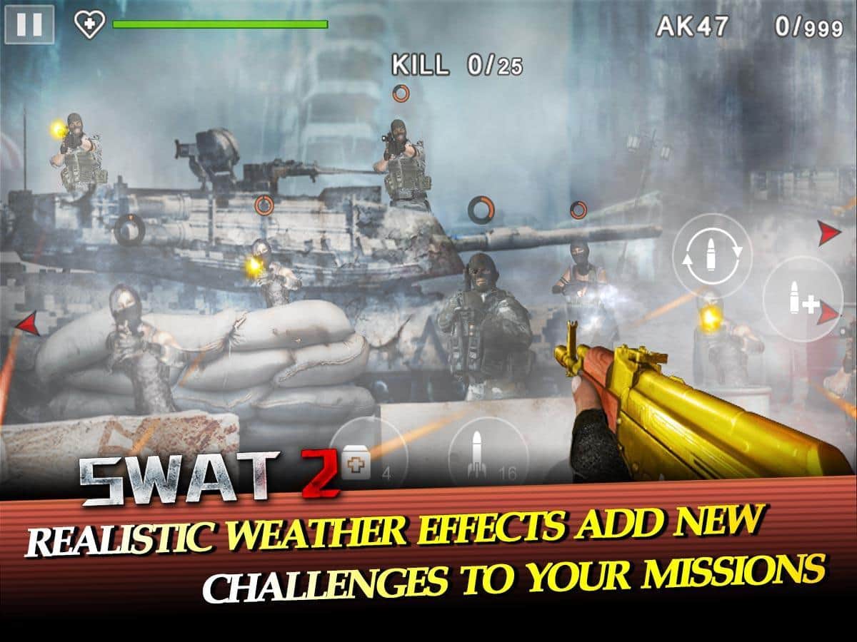 SWAT 2 - Size, nişancı tarzında oldukça kaliteli bir Android oyunu sunuyoruz. Sizi, iyilik ile kötülük arasındaki savaşta yer alacak birinci sınıf savaşçılardan oluşan bir ekip bekliyor. Her gün terörist gruplar dünyada kaos yaratıyor. Ve sadece sizin ekibiniz onları durdurabilir. Savaşlarınız, hem gündüz hem de gece, çeşitli ülkelerde gerçekleşecek. Ayrıca oyunda iyi bir silah ve geliştirme cephanesi var.