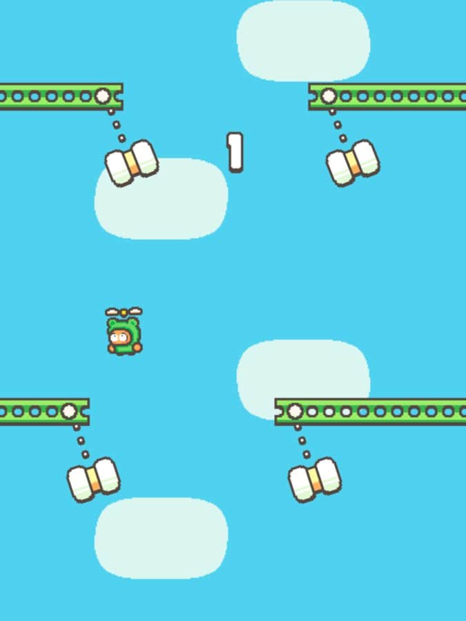 Swing Copters 2, ünlü Flappy Bird oyununun geliştiricisinden bir Android oyunudur. Bu oyunda, kafasında pervane olan ana kahramanı kontrol edeceksiniz. Telefonunuzun veya tabletinizin ekranına dokunun ve ana kahramanın hareket yönünü değiştirin. Kahramanınızın dev çekiçlerle çarpışmaktan kaçınmasına ve duvarlara değmemesine dikkat edin, aksi takdirde ölecek ve oyun yeniden başlayacaktır. Mümkün olduğunca yükseğe çıkın ve en iyi liderlik tablosu sıralaması için arkadaşlarınızla yarışmak için yeterli puanı toplayın. Bu zorlu bir oyun, bu yüzden onu geçmek için sabırlı olun.