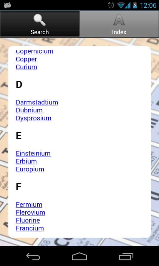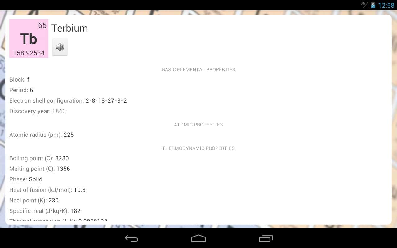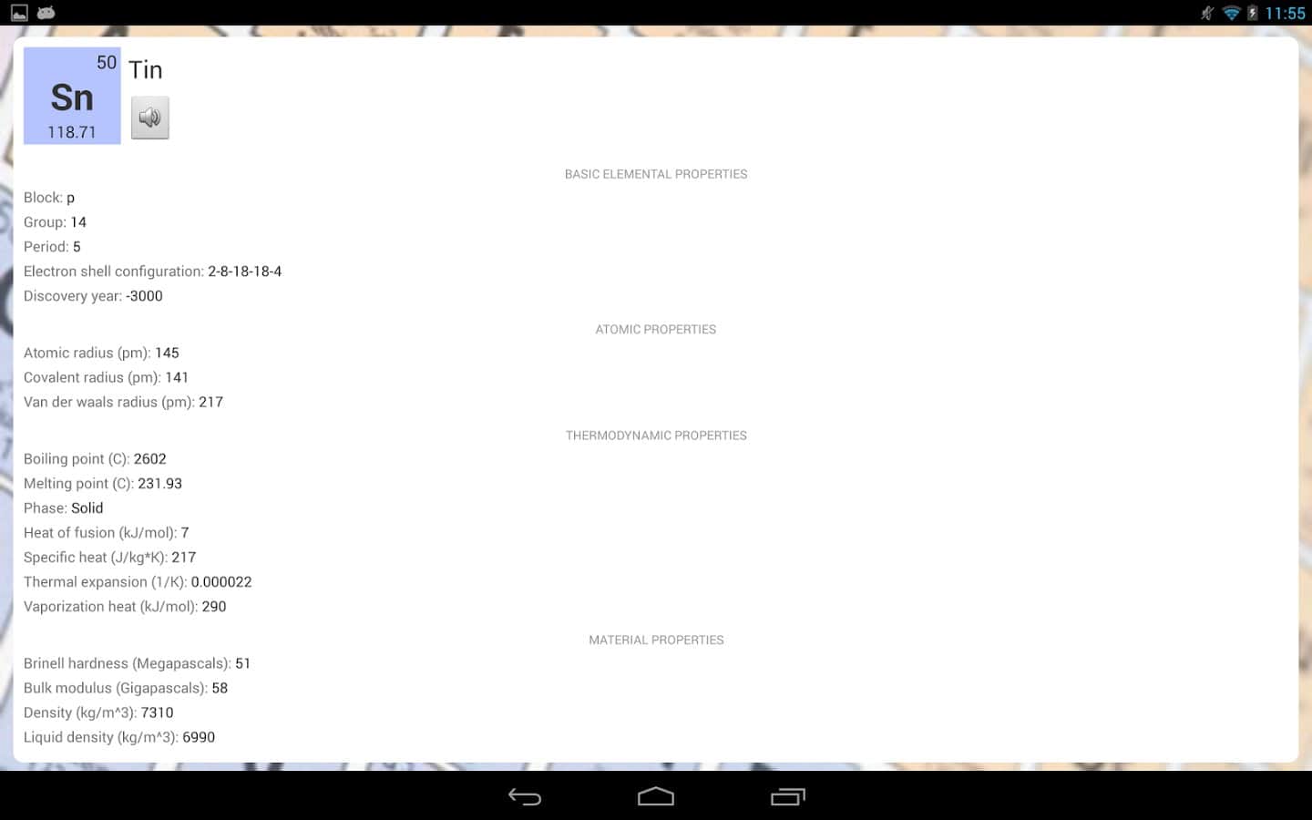 Mendeleyev Tablosu Android'de, yeni başlayan kimyagerlerin bu tabloyu tanımasına yardımcı olacak, zaten bu bilimi öğrenmiş olanlara ise öğrendiklerini unutmamalarında yardımcı olacaktır. Her bir element hakkında 30'dan fazla gerçek sizi mutlu edecek. Elementlerin adlarını içeren ses klipleri. Ayrıca, bilginizi test ederek kontrol edebilirsiniz. Tablo, arama veya indeks aracılığıyla gerekli elemana hızlı ve kolay erişim imkanı sunar.