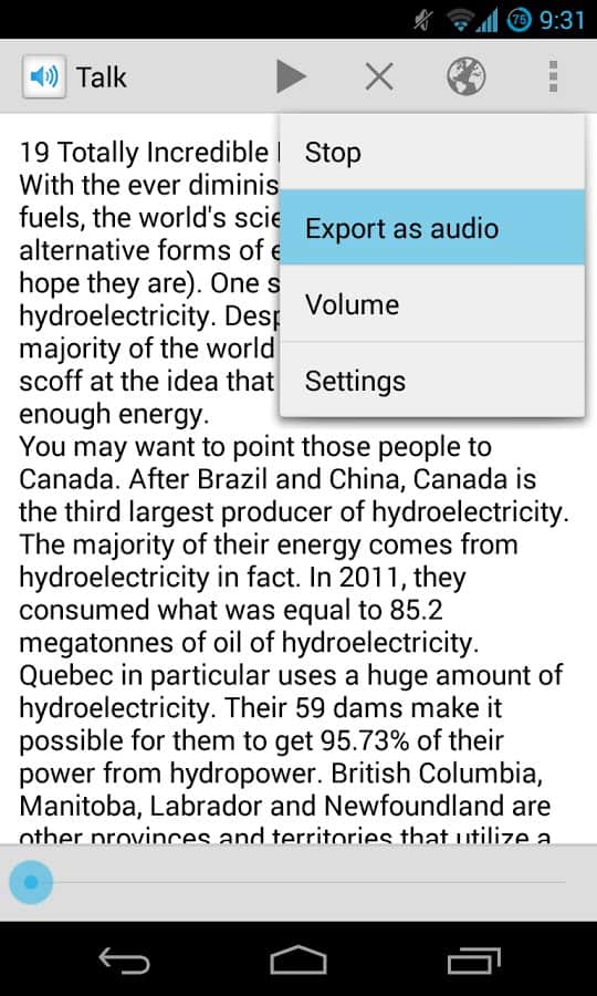 Konuşma - Metinden Sese – itsjoui geliştiricisinden Android için metni sesli WAV dosyasına, yani konuşmaya dönüştürebilen bir program. Yani, eğer meşgulsünüz ve bir web sayfasında veya herhangi bir başka uygulamada neyin konuşulduğunu kesinlikle bilmeniz gerekiyorsa, seçili metni içe aktarın ve her iki aktiviteyi aynı anda birleştirin! Tek bir şart var ki, cihazınızın metinden sese dönüştürücü motoruyla donatılmış olması gerekiyor. İyi kullanımlar!