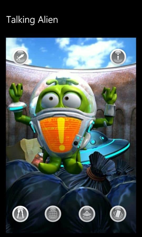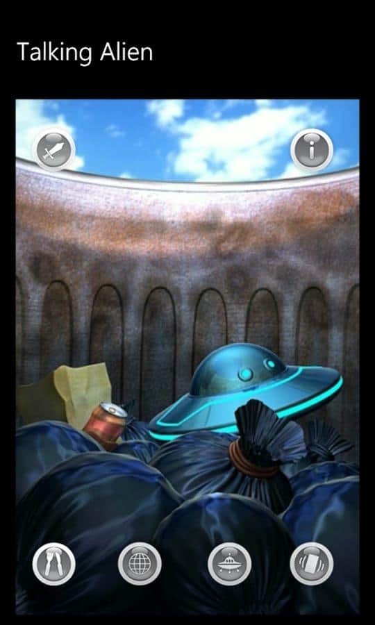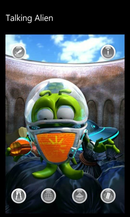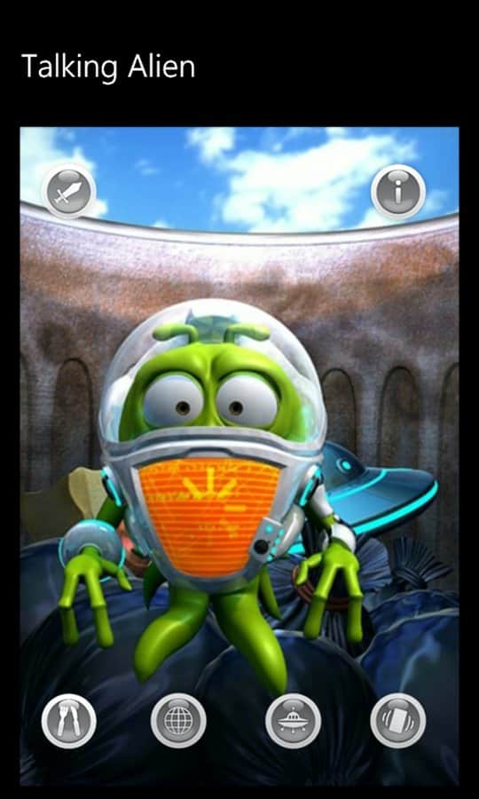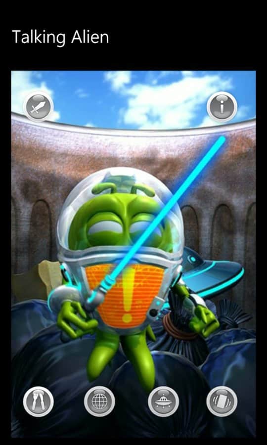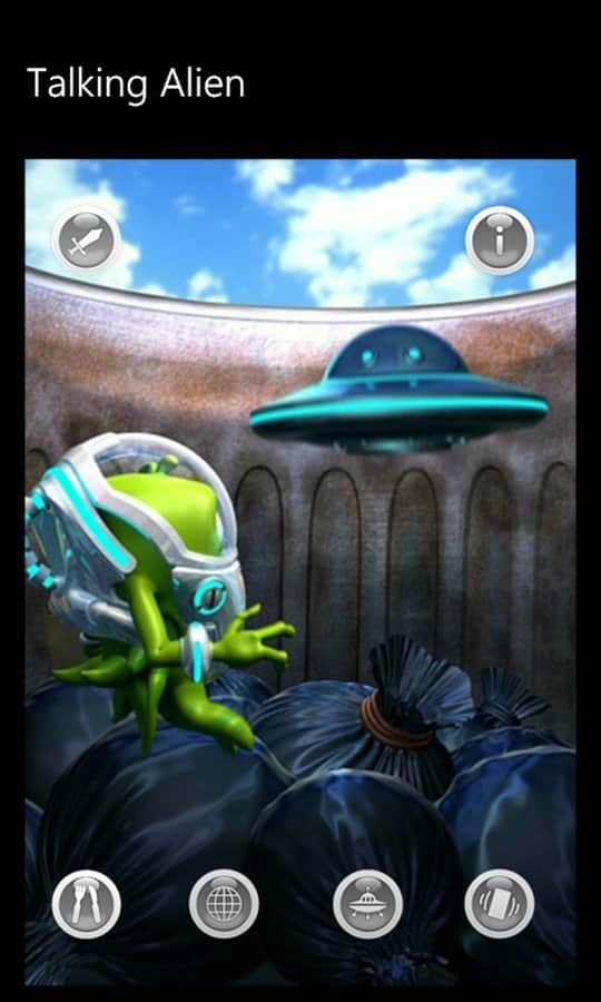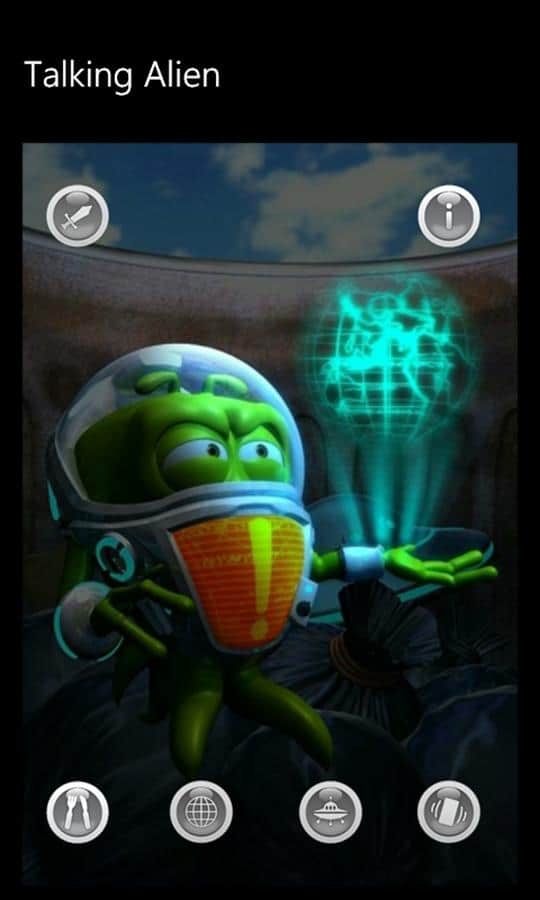Konuşan Uzaylı - Windows Phone için bir oyun, burada kendinize komik bir uzaylı arkadaş bulacaksınız. O, uzay gemisiyle birlikte Dünya gezegenine gelen bir yabancı. Ne yazık ki, uzay gemisi iniş sırasında parçalandı ve o, görevde hayatta kalan tek kişi oldu. Uzaylı, kimsenin olmadığı ıssız bir yerde sıkışıp kaldı ve kimse onu eğlendirmiyor. O yalnız. Ona moral vermekte yardımcı olabilirsiniz.