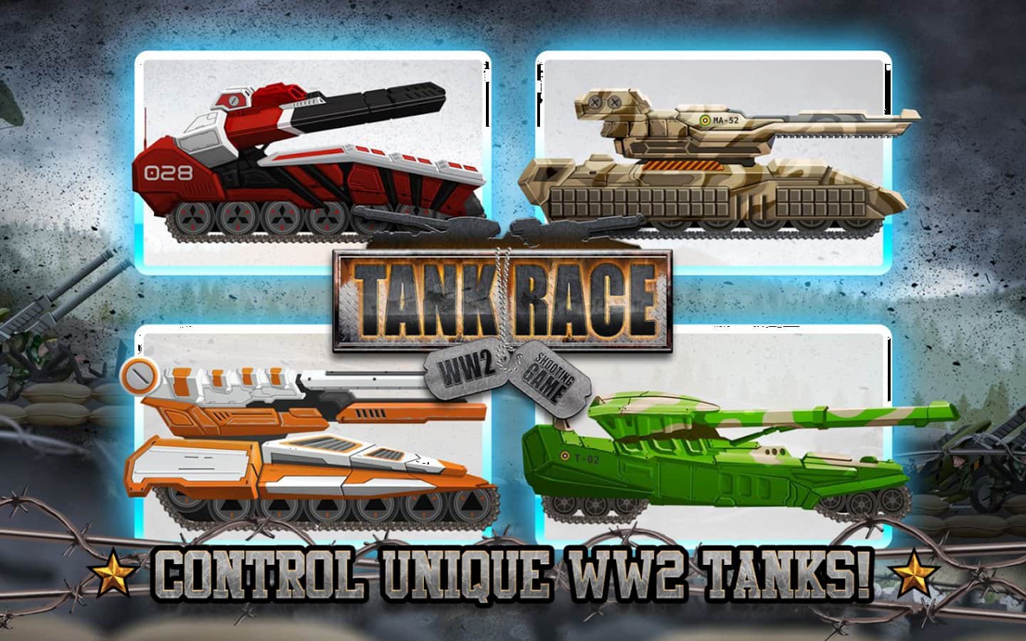 Tank Yarışı: II. Dünya Savaşı Atış Oyunu – zırhlı tankınızı kontrol altına alın ve onu savaş alanlarında yönlendirin. Bu oyunda, tankınızı düşman teknikleri ve mayınlarla dolu savaş alanlarından geçirerek belirlenen hedefleri ve görevleri yerine getirmekle sorumlusunuz. Düşmanın birçok saldırısını önleyin ve onların dünyayı yok etmesine izin vermeyin. Büyük bir hızla ileriye doğru fırlayın ve telefonunuzun veya tabletinizin ekranına zamanında dokunarak çeşitli eylemleri gerçekleştirin. Düşman tanklarına ve uçaklarına topunuzdan ateş edin ve yolunuzdaki tüm engelleri yok edin.