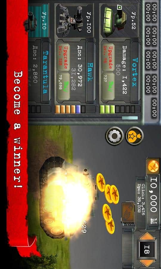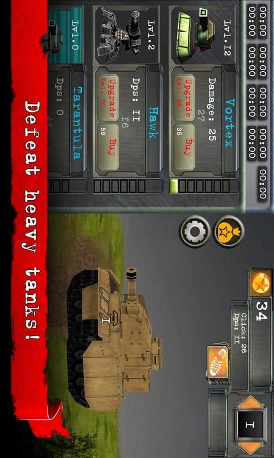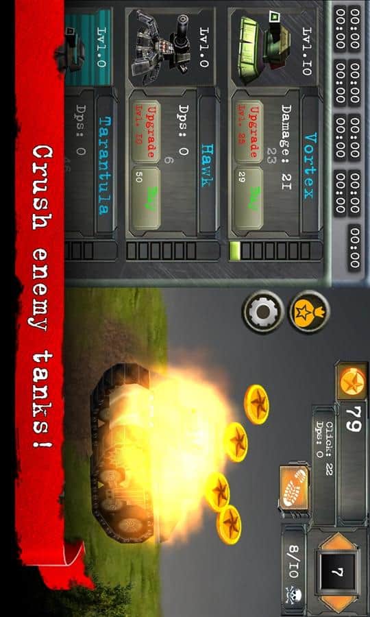 Tank Tıklayıcı - zamanınızı geçirebilecek bir oyun. Oyun oldukça basit, düşünmenize, beyin kaslarınızı zorlamaya ve ağır bir günden sonra yüklenmenize gerek yok. Sadece telefonumuzu alıp tıklıyoruz, her şey kolay ve basit ama oyun yine de sizi içine çekiyor. Tüm tankları yok ediyoruz, bu amaçla kuleleri yardımımıza alıyoruz. İlk fırsatta hedefleri daha kolay yok etmek için silahımızı yükseltiyoruz.
