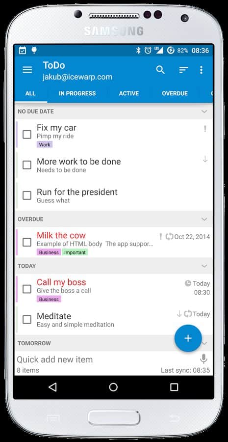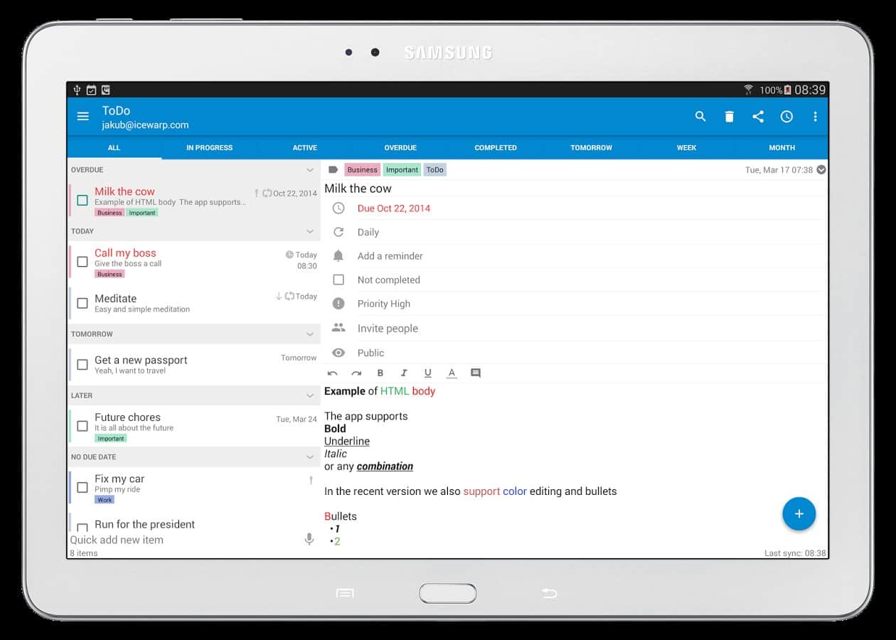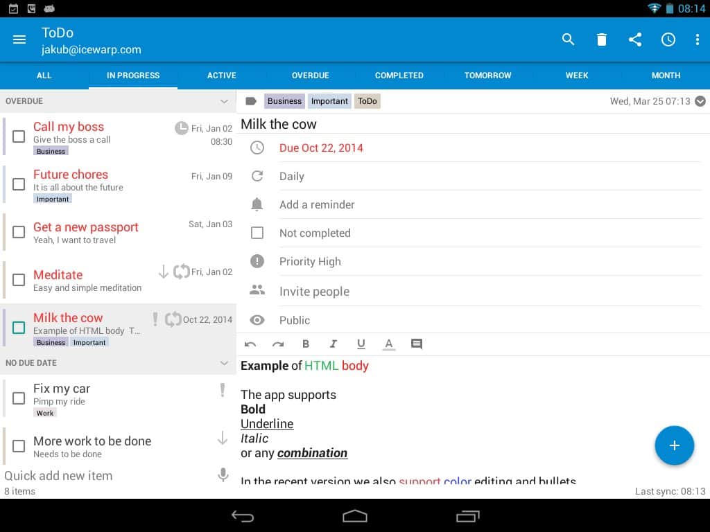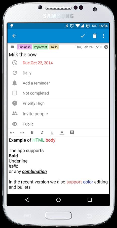 MS Exchange için Görevler ve Notlar – Jakub Klos tarafından geliştirilen Android akıllı telefonlar/tabletler için harika bir ücretsiz uygulama, standart takvimi görevler ve notlarla başarılı bir şekilde tamamlar. Ayrıca MS Exchange ile, Hotmail/Outlook.com hesaplarıyla (ve masaüstü Outlook 2013 ile ilgili olarak) senkronizasyonu destekler.
