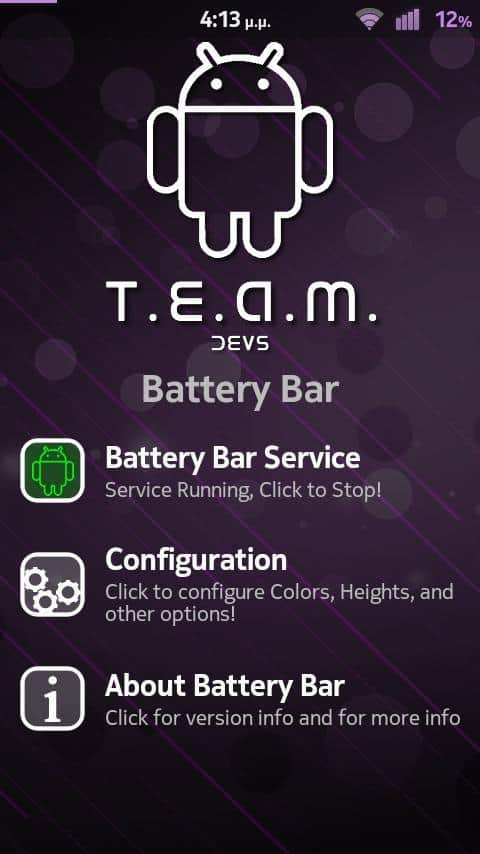 T.E.A.M. Batarya Çubuğu – Android cihazında batarya şarj göstergesi. Cihazınızda görmek istediğiniz batarya şarjını belirlemek için çizgi kalınlığını ve yukarıda mı yoksa aşağıda mı olacağını seçmeniz gerekiyor. Tam, orta ve düşük şarj için renk paletini belirliyorsunuz. Seçtiğiniz renk paletini değiştirmek için ayarlanabilir bir işaret var. Uygulamanın ana menüsündeki olanaklar üç noktaya ayrılıyor: açma/kapama, özelleştirilebilir ayarların listesi ve uygulama hakkında bilgi.