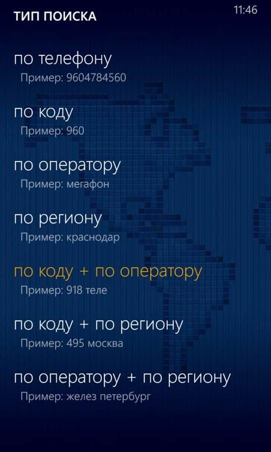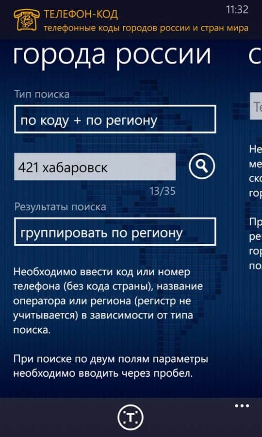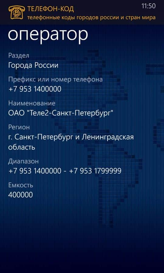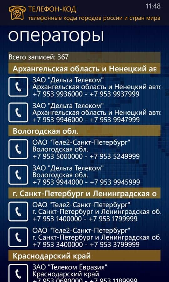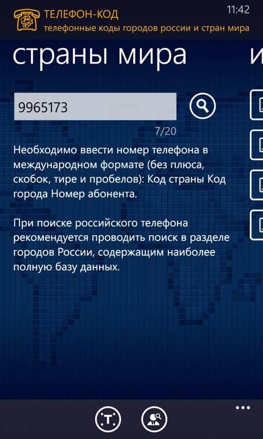 Rusya'nın şehir telefon kodları ve dünya ülkeleri, Windows Phone 7'de. Mobil operatörlerin en kapsamlı ve güncel kod veritabanı. Ön ek veya telefon numarasına göre operatör, ülke ve bölge belirleme.
