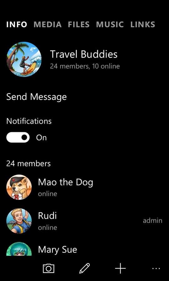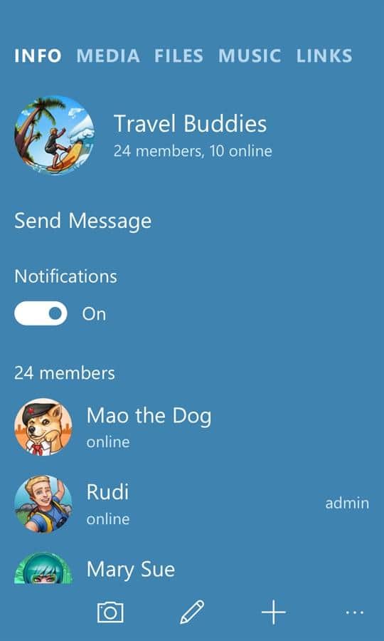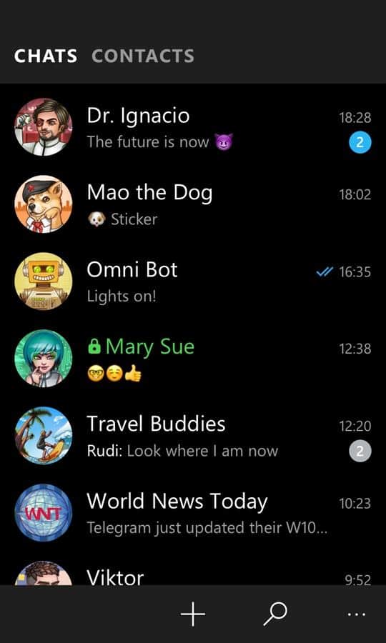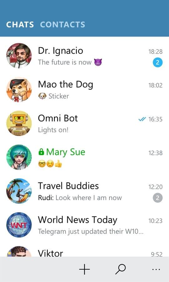Telegram Messenger – Windows Phone için popüler bir programdır; bu sayede dünyanın dört bir yanındaki arkadaşlarınız, meslektaşlarınız ve sevdiklerinizle iletişim kurabilirsiniz. 200'den fazla kişiyle ortak bir sohbet başlatın ve her zaman ve her yerde bağlantıda kalın. Sadece mesaj göndermekle kalmayacak, aynı zamanda 1GB'a kadar video dosyaları veya fotoğraflar gönderebileceksiniz. Gönderdiğiniz tüm mesajlar, sınırsız erişiminizin olacağı özel bir bulutta saklanacaktır. Mesajlarını gizlemek isteyenler için, yalnızca belirtilen alıcının okuyabileceği ve sonrasında silinecek olan 'gizli sohbetler' mevcuttur. Bu uygulamayı kullanın ve rahatlığını ve benzersizliğini değerlendirin.