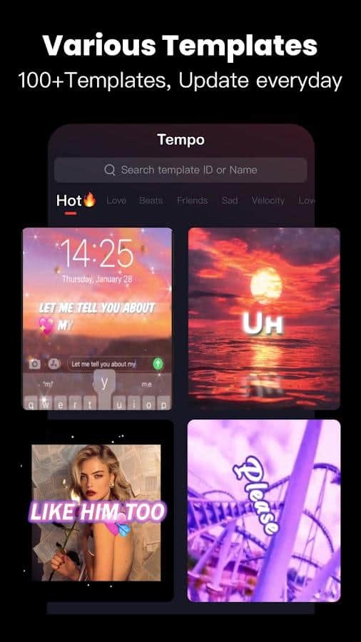 Tempo - Müzik ile Video Editörü - İstediğiniz gibi videoları düzenlemek için seçmek istediğiniz şablonu seçin. Kategori belirleme ve orada hangi seçeneklerin bulunduğunu görme imkanınız var: aşk, şarkı sözleri, emojiler, çizgi filmler, diğerleri. Videoya eşlik eden müziği ekleyin, videolar için fotoğraflar toplayın, ilginç özel efektler ekleyin ve alışılmadık geçişler yapın. Her videoyu yüklenen görüntüler, metinler, yazı tipleri, animasyonlar ve diğer verilerle benzersiz hale getirebilirsiniz. En sonunda sonucu sosyal medyada kolayca paylaşabilirsiniz.