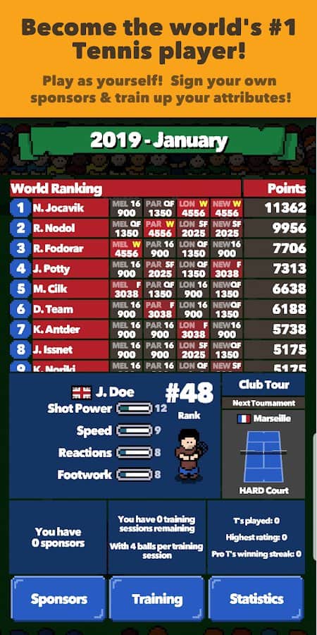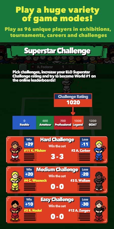 Tenis Süperstarları – Android için bir spor oyunudur, burada tenis oynayacaksınız. Oyunda sunulan 96 karakterden birini seçin ve en iyi oyuncu unvanı için yarışın. Oyun, her vuruş üzerinde tam kontrol sağlayan hassas bir kontrol sistemi ile oyuncuları mutlu edecek. Ayrıca bu oyunda kendinize özgü bir dış görünüşe sahip kendi sporcunuzu yaratma şansınız olacak. Bu spordaki kariyerinizi inşa edin ve herkese dünyanın en iyi tenisçisi olduğunuzu kanıtlayın. Arkadaşlarınız ve dünyanın dört bir yanındaki diğer oyuncularla yarışın.