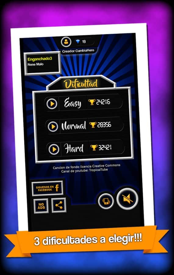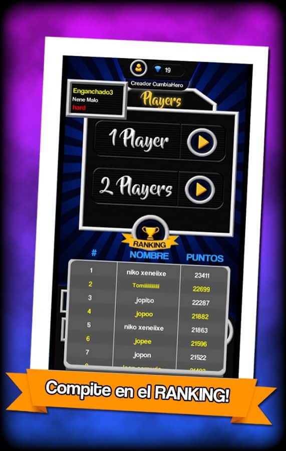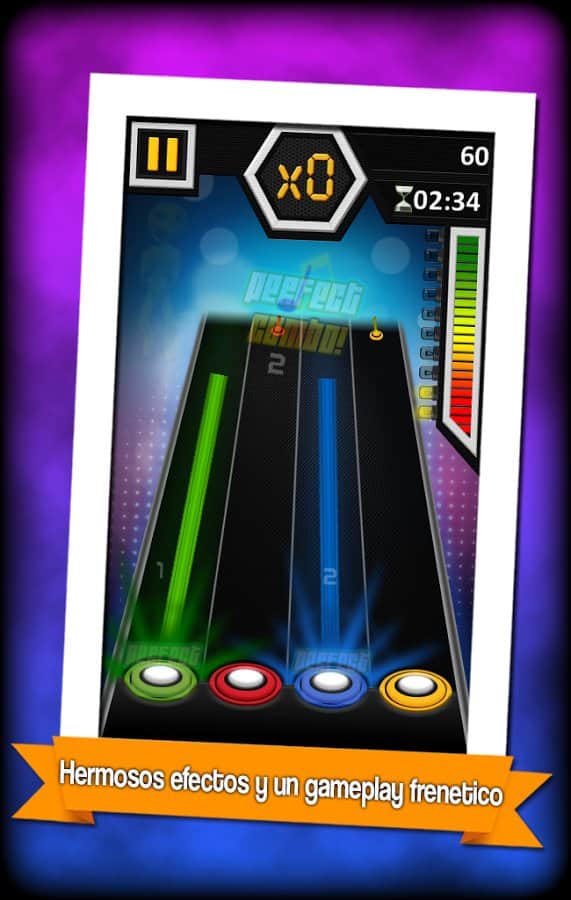 Cumbia Kahramanı – Android için harika bir müzik oyunu, farklı melodilerle dolu. Bu oyunda önünüzde farklı renklerde dört tel olacak, notalar bu teller üzerinde hareket edecek, sizin göreviniz özel butonlara zamanında basmak ve melodiyi elde etmek. Belirli bir renkteki nota butona yaklaştığında ona basın. Notaları kaçırmayın ve harika müzikler elde edin. Bu oyun gerçekten tepkinizi test edecek, oynayın ve zorluk seviyenizi belirleyin. Arkadaşlarınızla oynayın ve yeni melodileri açmak için yeterli puanı toplayın. Oyun basit kontrolleriyle sizi mutlu edecek.