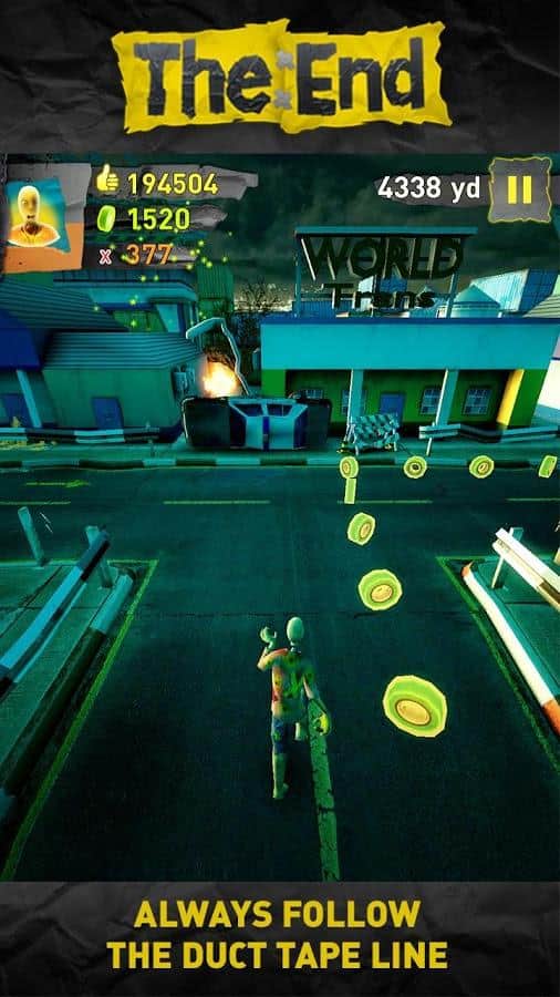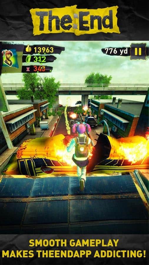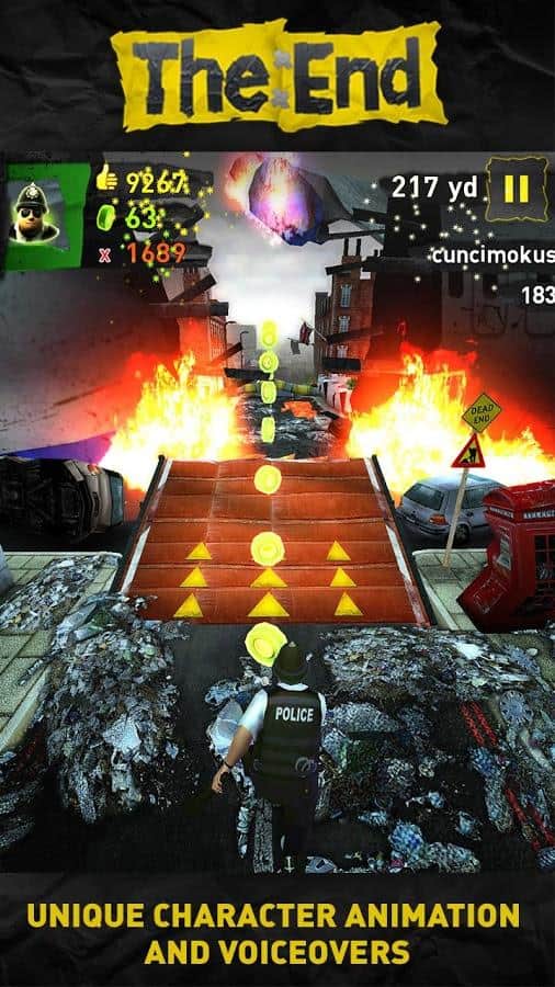 Son – Android için mükemmel bir koşucu. Dünyanın sonunun yakında geleceği size bildirildi ve işte geldi - kabul edin! Yıkılmış Londra'nın sokaklarında koşun. Yer altı geçitlerinden kaçınmaya çalışın, yanmış devriye araçlarının üzerinden olabildiğince yüksek atlayın ve ıssız şehirde güvenli bir yere ulaşın. Her gün beş meydan okumayla on dört gün koşu. Koşu sırasında bonusları toplayın ve son derece dikkatli olun. Sizi bekleyenler: yeni meydan okumalar, yeni oyun modları, müzik, yeni koşucu karakterler (Survivoress, Bobby ve Yukiko), GameCenter üzerinden arkadaşlarınızla yarışın! Londra kıyameti sizi bekliyor!