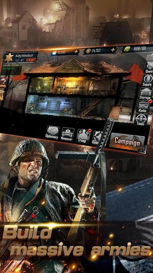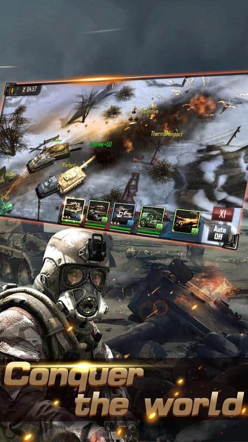 Büyük Savaş: Toplam Çatışma – Android için bir oyun, burada dünya savaşına katılacak ve yeni topraklar için savaşacaksınız. Bu oyunda dev bir devletin başkomutanı rolünü üstlenecek ve dünya hakimiyeti için rakiplerinizle savaşacaksınız. Büyük bir üs inşa edin ve onu düşman saldırılarından koruyun. Dev bir ordu toplayın, birlikleri ve askeri teknolojiyi yönetin ve onları savaş alanlarına sürün. Tek bir parmak dokunuşuyla birliklerinizi savaşa gönderin ve rakiplerinizi yok edin, savaş sonrası değerli ganimetler ve bonuslar toplayın. Üslerinizi geliştirin ve ordunuzu yeni birliklerle güçlendirin. İttifaklara katılın ve arkadaşlarınızla kendi ittifaklarınızı oluşturun.