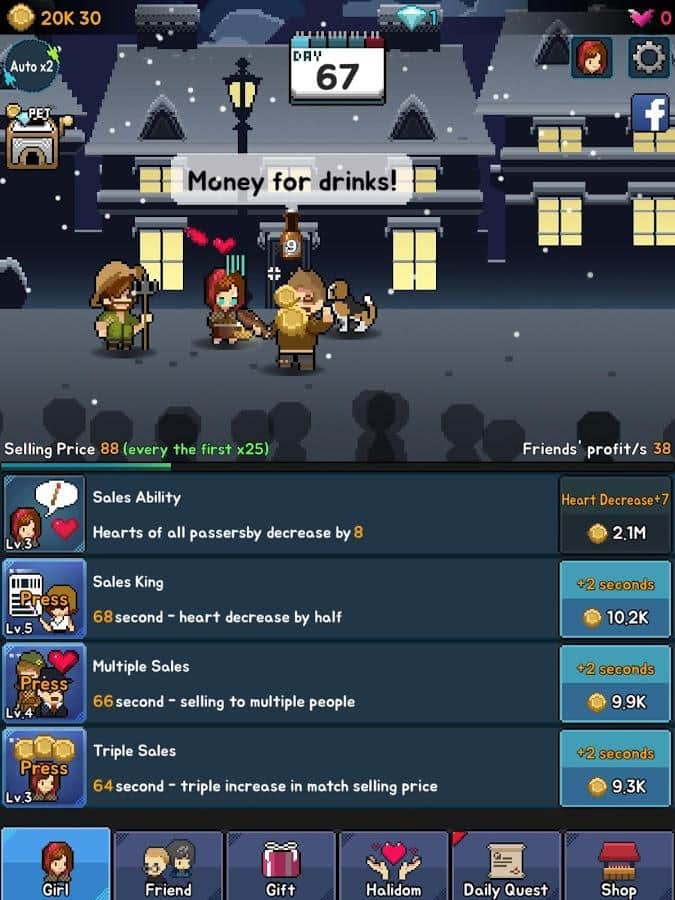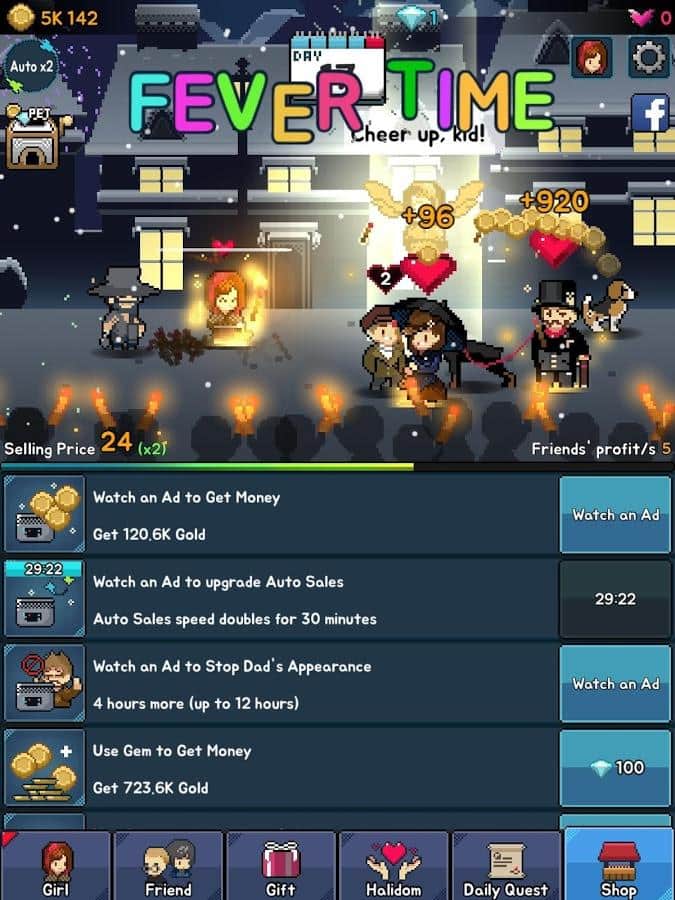Oyun süreci, bir tıklama oyunu ile dokunma arcade oyunu arasında bir şeydir; amacınız, geçen vatandaşlara belirli sayıda tıklamak, bu sayede para kazanmak ve bu paralarla yeteneklerinizi geliştirmek, ek envanter satın almak ve daha fazla insanı mutlu etmek, dolayısıyla daha fazla para kazanmak.