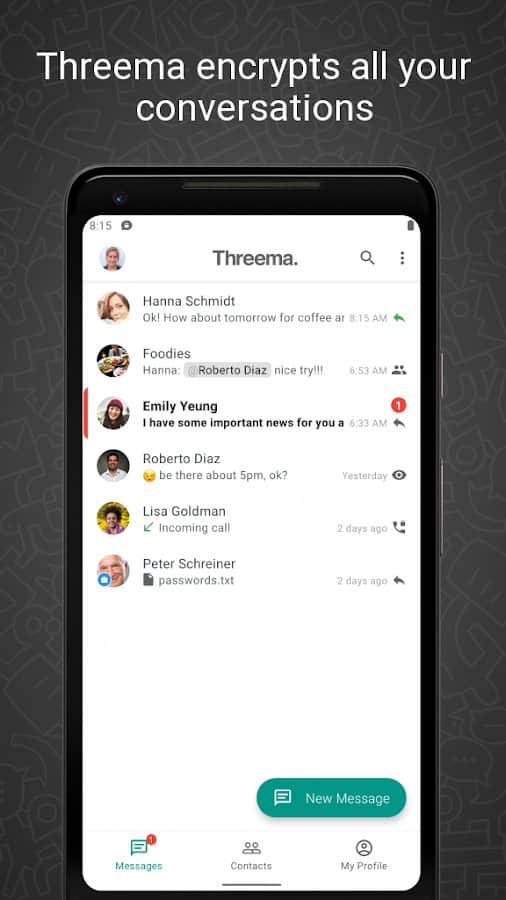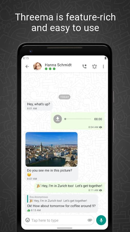 Threema – mükemmel bir Android uygulaması olup, mesajlarınızı o kadar şifreleyebilir ki, yalnızca siz ve alıcı bunları okuyabilir, sunucu operatörleri bile okuyamaz. Uygulamada uçtan uca şifreleme kullanılır ve tüm sunucular İsviçre'de bulunmaktadır. Mesajlarınız güvenli bir şekilde korunuyor!