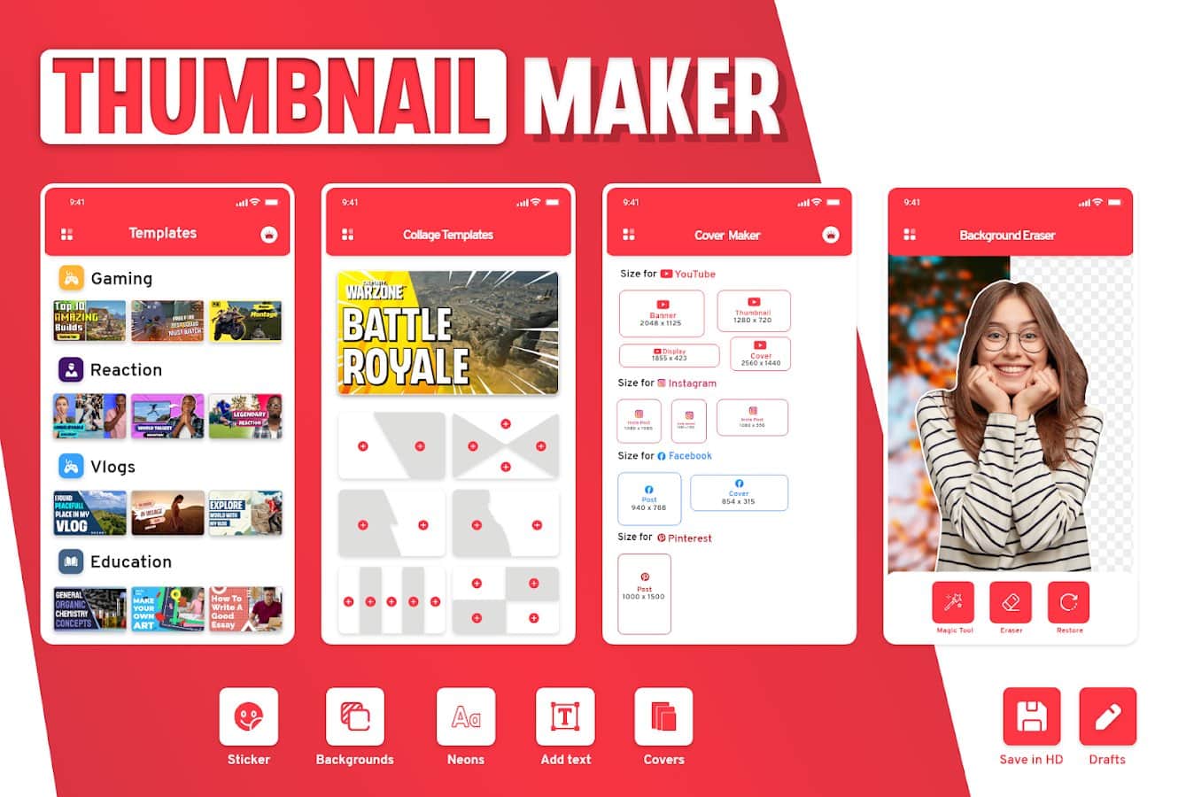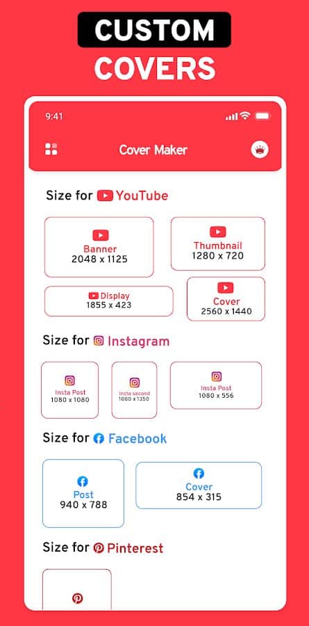 YouTube için video önizlemesi - Youtube'da parlak, canlı ve en önemlisi konusuna uygun kapaklarla öne çıkın! Uygulamada, mevcut 16'dan fazla kategori bulunmaktadır; burada hazır kapak şablonları seçebilir ve bunları kendi ihtiyaçlarınıza göre düzenleyebilirsiniz. Her şeyi sıfırdan yaratmaya karar verdiyseniz, seçiminiz için 200'den fazla farklı arka plan, şık yazı karakteri çiftleri, sıradışı çıkartmalar ve daha fazlası mevcuttur. Hayal ettiğinizi gerçekleştirmek için profesyonel bir tasarımcıya ihtiyacınız yok; bu görevi kendiniz başarıyla tamamlayabilirsiniz.