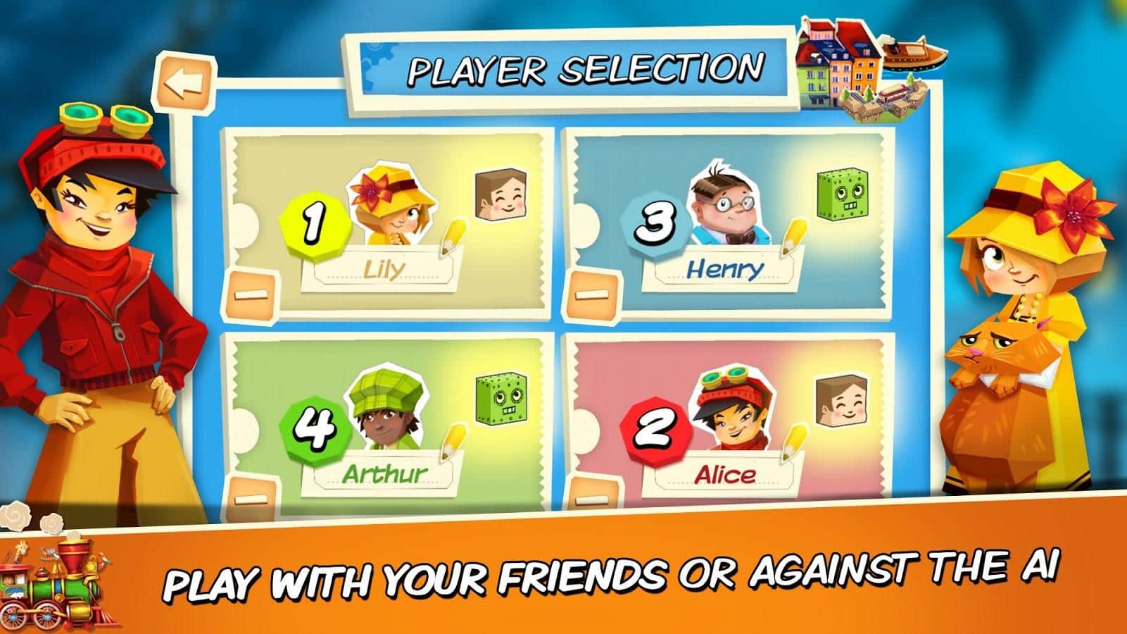 Biletle Seyahat: İlk Yolculuk – android için bir masa oyunu, burada farklı şehirlere seyahat edeceksiniz. Seyahatinize hemen başlayın ve bilet alın, haritada rotalarınızı çizin. Her bilet, birbirine bağlamanız gereken iki şehri gösterecek ve bileti tamamlayacaksınız. Rota tamamlandığında, size yeni bir bilet verilecektir. İlk olarak altı bileti kendi desteğinden tamamlayan oyuncu kazanır. Bu oyunda farklı şehirlerin tarihleri ve mimari anıtları hakkında bilgi edinin. Arkadaşlarınızla aynı anda 4 kişiye kadar oynayın veya zeki bir yapay zekaya meydan okuyun ve rotalarınızı daha hızlı tamamlamaya çalışın.