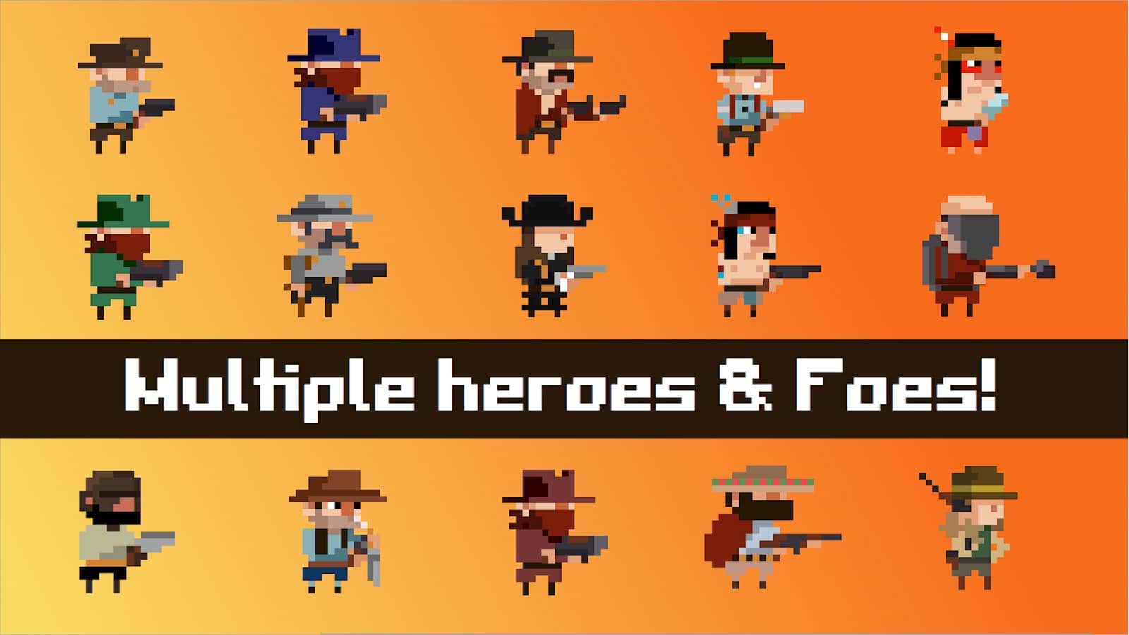 Küçük Vahşi Batı - Sonsuz 8-bit piksel mermi cehennemi – Android'te, Vahşi Batı'da seyahat edecek ve haydutları ve suçluları yok edeceğiniz bir aksiyon oyunu. Ana karakteri kontrol altına alın ve sonsuz düellolara ve çatışmalara katılın. Salona girin ve düşmanlara karşı ateş açın. Bu oyunda mükemmel reflekslerinizi gösterin, rakibinizden daha hızlı ateş ederek ve aynı zamanda karşı ateşten kaçınarak. Yok ettiğiniz her düşman için harika ödüller ve paralar kazanın. Oyunun yeni karakterlerini keşfedin, bunlar benzersiz bir görünüme sahip olacak.
