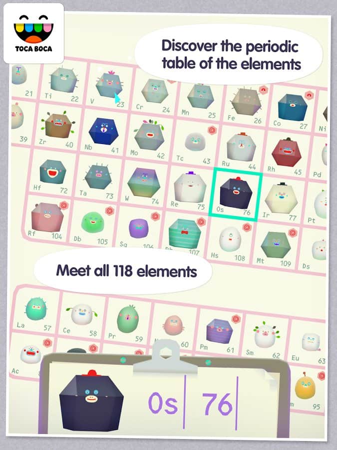 Toca Lab - Eğer kimyager veya bilim insanı olmak istiyorsanız, bu oyun size bu özellikleri kazandıracaktır. Oyunda size periyodik tabloya ait 118 element bekliyor. Malzemelerle çeşitli deneyler yapın, özelliklerini inceleyin ve gelecekte gerçek bir bilim insanı olmak için deneyim kazanın. Malzemelerle şu işlemleri gerçekleştirebilirsiniz: