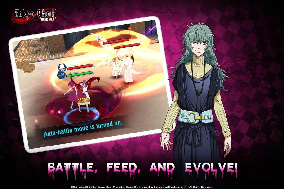 Tokyo Ghoul: Karanlık Savaş – Android için anime tarzında bir RPG, aynı adlı animasyonun hikayesine dayanıyor. Bu oyunda, anime'deki sevdiğiniz karakterlerle yeniden karşılaşacaksınız ve onların yeteneklerini kullanarak savaşacaksınız. Tokyo'nun karanlık ve tehlikeli sokaklarını keşfedin ve anime'den tüm bilinen yerleri ziyaret edin. Oyunda sunulan 50 karakterden kendinize bir kahraman seçin ve oyununuza karşıt taraflardaki oyunculardan bile oluşan yenilmez takımınızı oluşturun; onlar yan yana savaşabilirler. Oyun boyunca karakterlerinizi geliştirin ve mükemmel sonuçlar elde edin. Deneyimli oyunculara meydan okuyun ve arenada savaşın.