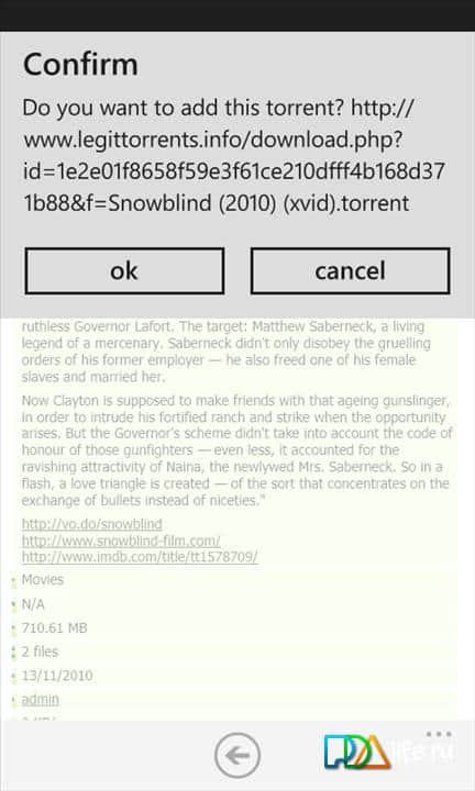 - torrent hakkında bilgi görüntüleme (örneğin, takipçiler ve dosya listesi)