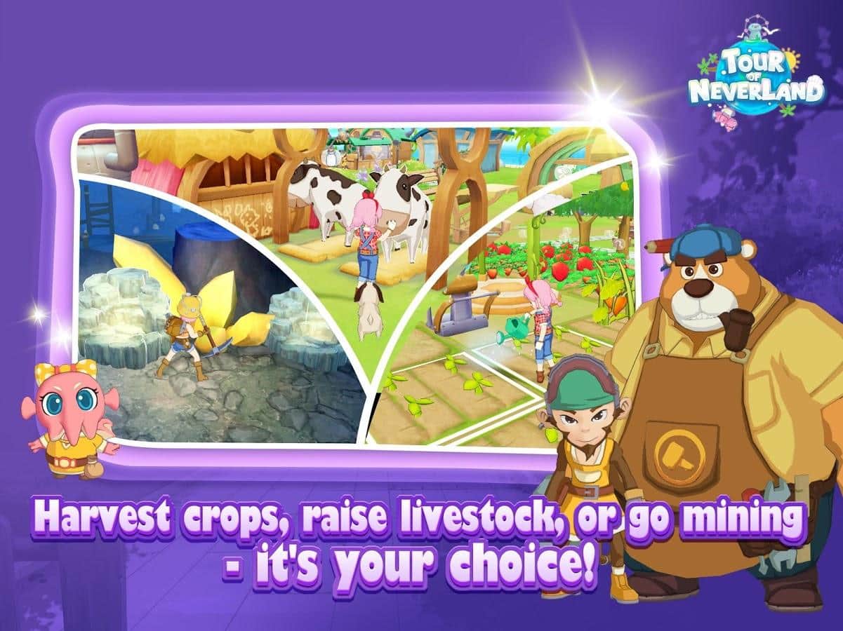 Neverland Turu - Tropik adada kendi çiftliğinizi yönetin, yeni arazi parçalarını keşfedin, mahsulleri ekin, her türlü tarımsal yapıyı inşa edin ve evinizi istediğiniz gibi süsleyin! Okyanustan balık tutun veya deniz canlılarını yakalamak için dalış yapın. Ziyaretçileri çekmek ve yeni arkadaş hayvanlar edinmek için bir yurt inşa edin. Hatta bir maden arabasına atlayıp değerli hazineleri bulmak için maden derinliklerini keşfedebilirsiniz!