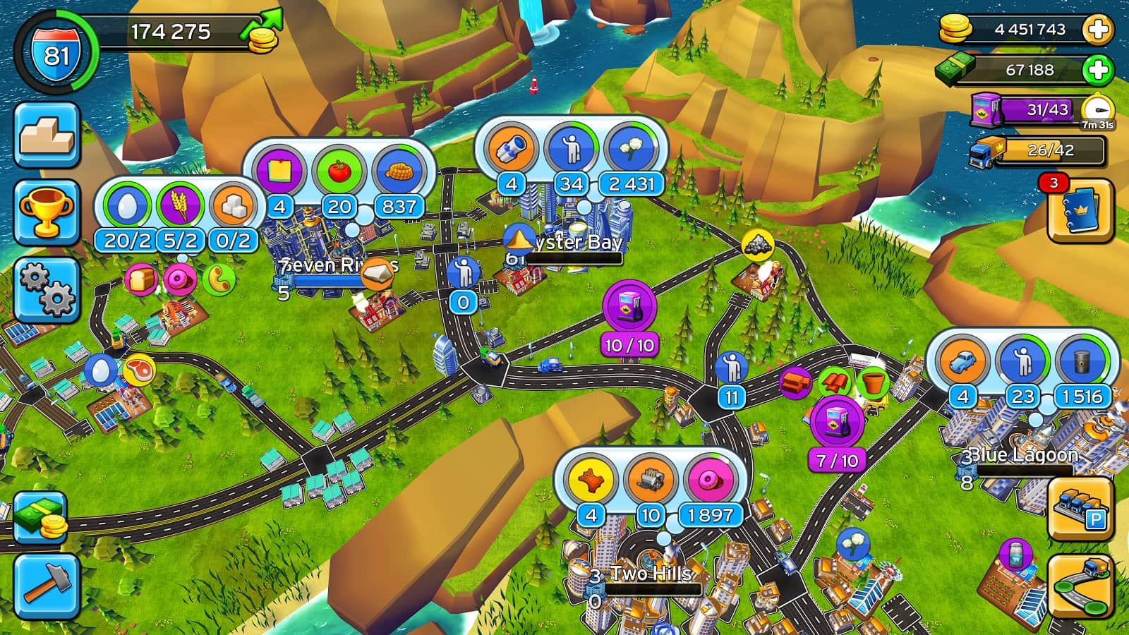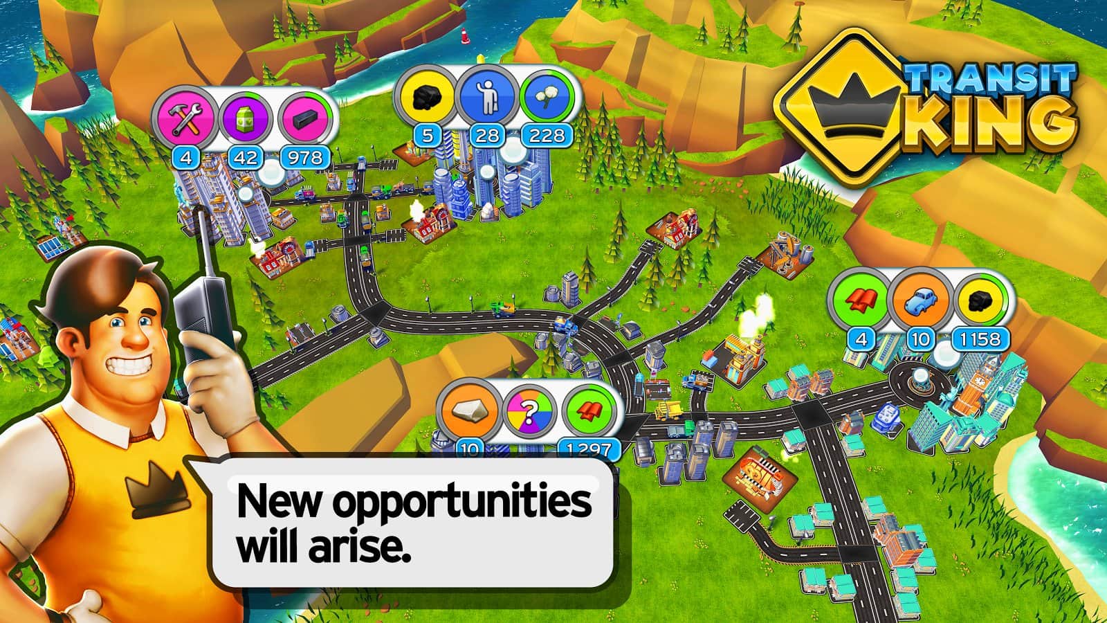 Transit King – android için heyecan verici bir strateji oyunu, burada büyük bir adayı yöneteceksiniz. Bu oyundaki ana görevlerinizden biri, büyük şehirler inşa ederek ve bunları yollarla birbirine bağlayarak adanızı geliştirmek ve iyileştirmektir. Tüm görevleri ve oyunun görevlerini yerine getirin ve adanızın refahını sağlayarak mümkün olan en çok parayı kazanın. Karayolları ve demiryolları inşa edin ve şehirleri, köyleri, fabrikaları ve çiftlikleri birbirine bağlayın. Doğal kaynakları çıkarın ve kazandığınız paralarla yeni yollar inşa edin. Trafiği yönetin ve büyük megakentler inşa ederek şehrinizi geliştirin.