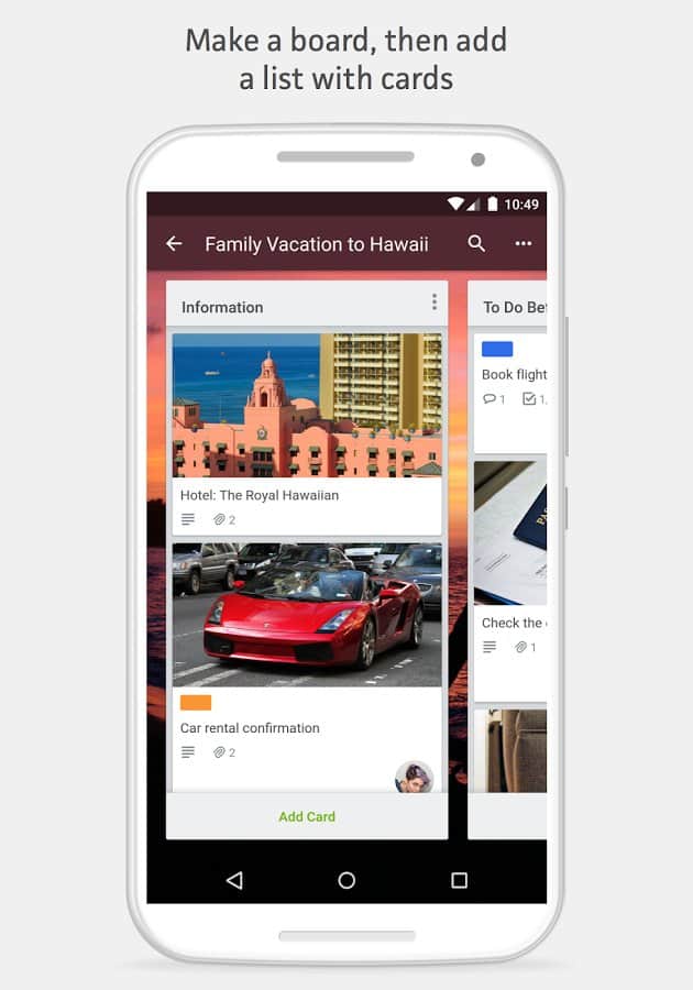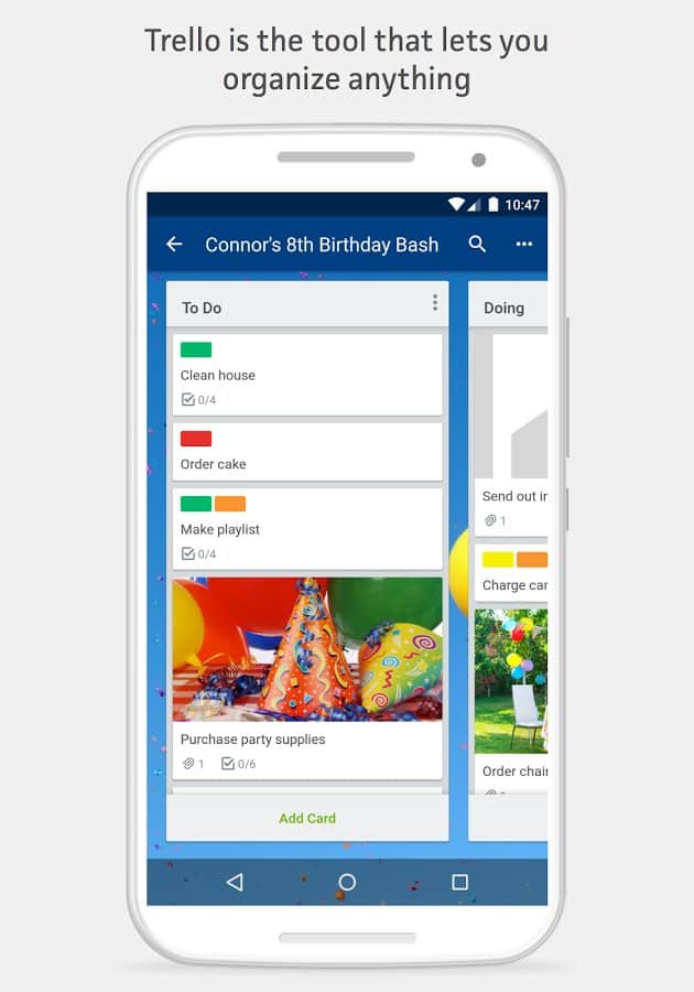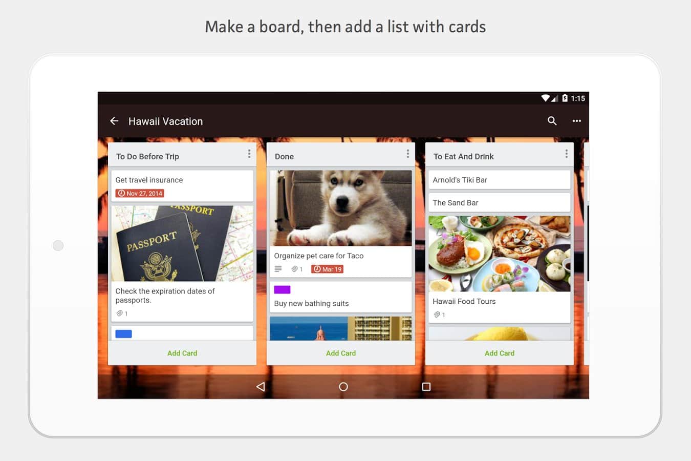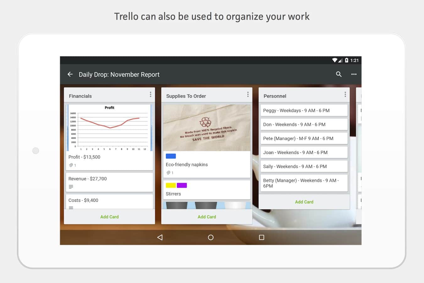 Bazı insanlar doğuştan düzenli ve odaklanmışken, bazılarına daha az şans verilmiştir ve kendilerini düzenlemek için yardımcılar veya yardımcı araçlar gerekmektedir. İşte bu tür bir "sekreter" Trello olabilir. Servis, sadece bir kişi tarafından değil, bir grup tarafından da kullanılabildiği için, Trello küçük bir ekibin çalışma düzeni için mükemmel bir uyum sağlar. Uygulama içinde görevler oluşturulabilir, bunlara resimler, dosyalar ve bağlantılar eklenebilir, yerine getirilme zamanı ve sorumlu kişiler atanabilir. Ayrıca, her bir belirli görev hakkında tartışmalar da yapılabilir. Uygulamanın tasarımı tamamen Material Design konseptine uygundur.
