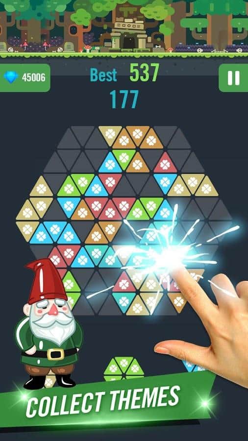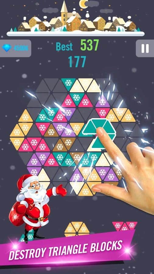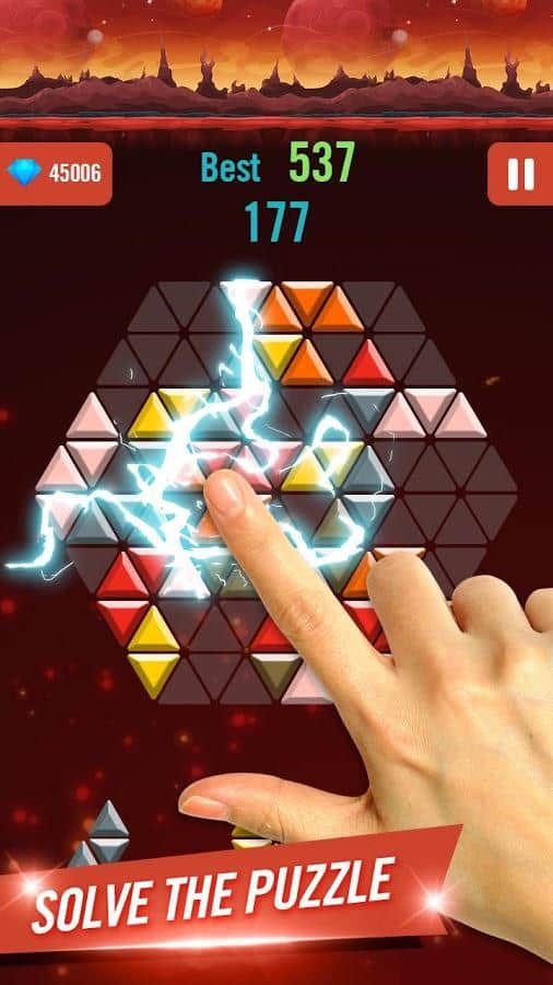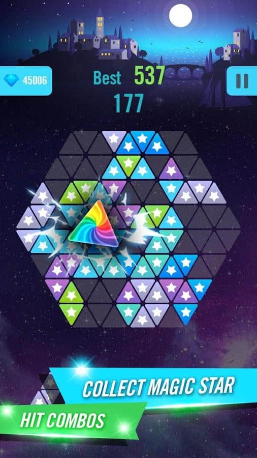 Üçgen Yıldız: Blok Bulmaca Oyunu - Android için bir bulmaca oyunudur, burada altıgen oyun alanına şekilleri sürükleyeceksiniz. Telefonunuzun veya tabletinizin ekranının sol alt köşesinde üçgenlerden oluşan şekiller bulunmaktadır, amacınız bunları oyun alanına yerleştirerek boş alanları doldurmaktır. Bloklardan yatay veya dikey sıralar oluşturmalı ve onları patlatarak diğer bloklar için yer açmalısınız. Yeterli puanı toplayın ve liderlik tablosunda daha yukarılara çıkın.
