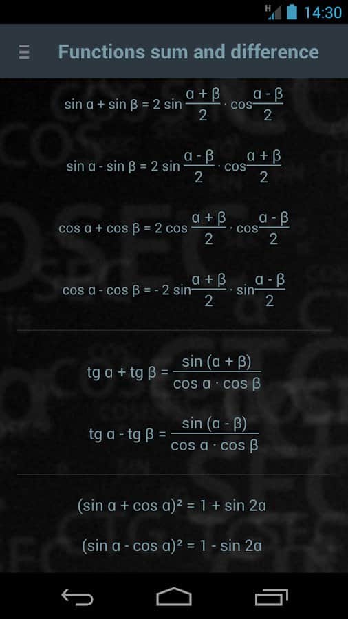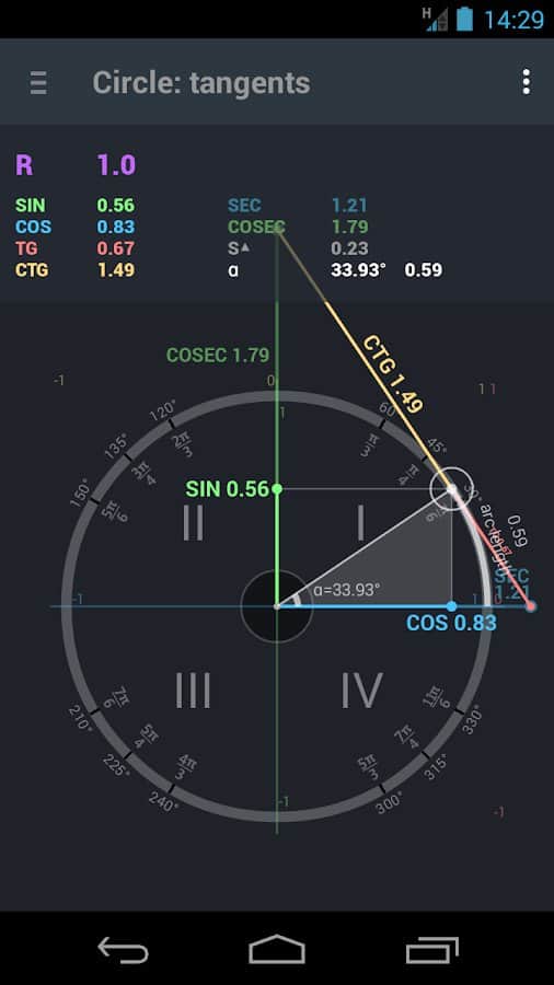 Trigonometri çemberi - Bu program, sinüs, kosinüs, tanjant, kotanjant, sekant, ve kosekant değerlerinin derece veya radyan cinsinden nasıl hesaplanacağını anlamayı kolaylaştıracak bir tür kılavuz olarak öğrencilere ve üniversite öğrencilerine önerilmektedir. Ayrıca, uygulama bu fonksiyonları ayrıntılı olarak açıklar ve değerlerinin bir tablosunu içerir.