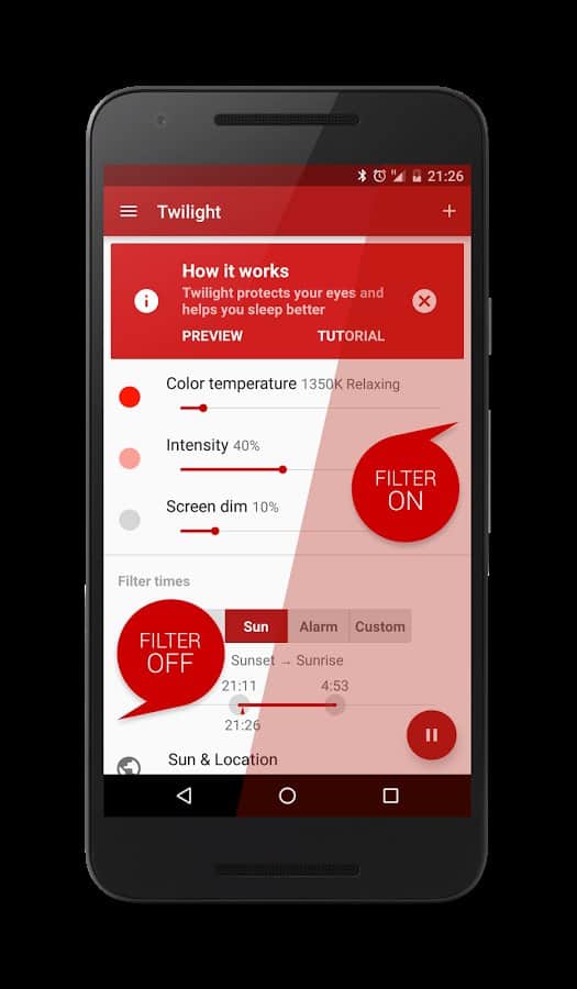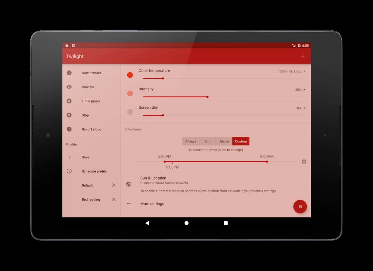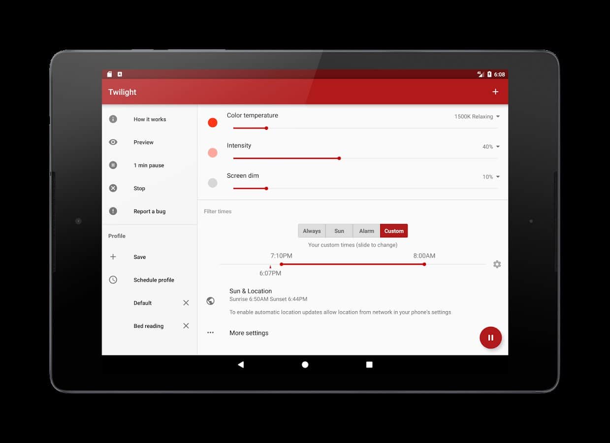 Alacakaranlık - Bilim adamları uzun zamandır parlak ışığın insan beynini etkilediğini ve böylece yaşam ritmini bozduğunu kanıtladı. Uyumadan önce tabletinizde haber okumaya karar verdiğinizde, onu bir kenara koyduğunuzda uykunuz bir anda kaçıyor mu? İşte gözlerinize vuran ışık yüzünden uyumak istemiyorsunuz. Bu uygulama bu sorunu çözmeyi amaçlıyor. Belirli bir zamanda, belirli bir zaman diliminde, cihazınızın ekran parlaklığını değiştirecek şekilde ayarlayabileceksiniz. Üstelik bunu istediğiniz gibi yapacak. Uygulama aslında çok basit, ancak sağlıklı bir uyku ve göz sağlığınızı korumanıza yardımcı olabilir.