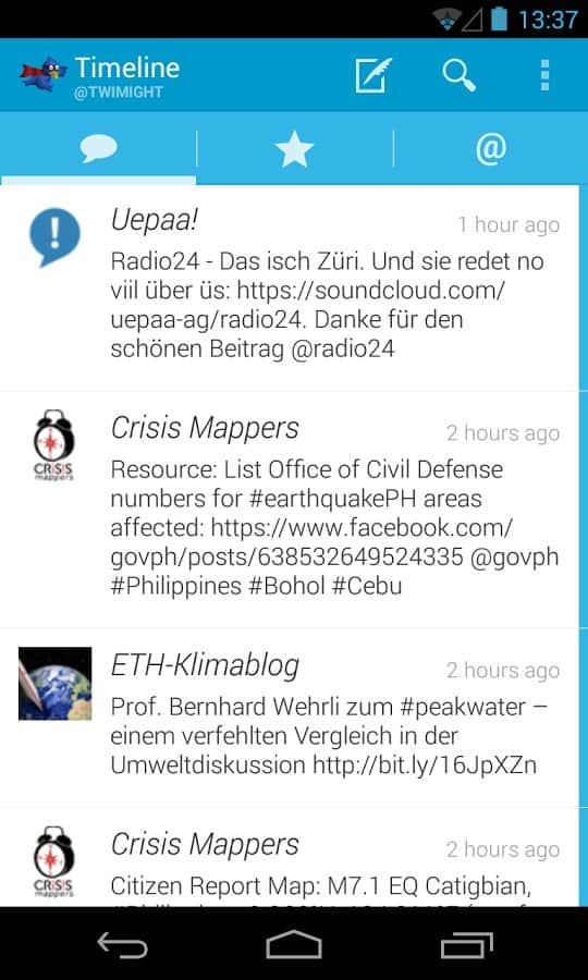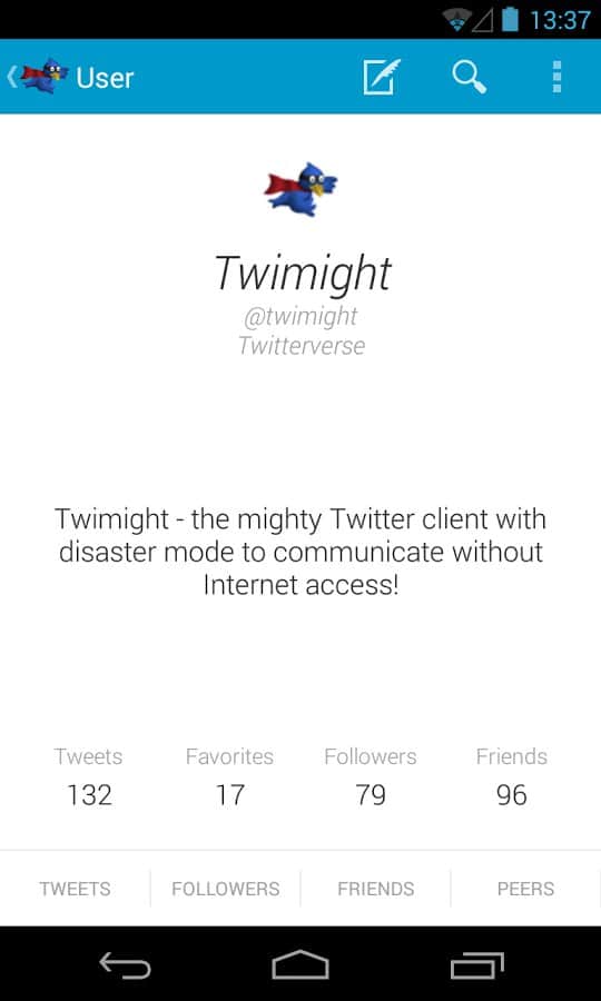 Twimight for Twitter - basit ve tamamen ücretsiz, CSG ETH Zurich geliştiricisinden Android cihazlar için açık kaynaklı bir Twitter istemcisi. Bu uygulama, herhangi bir rahatsız edici reklam içermemekte, güzel ve rahatsız etmeyen Holo tarzında tasarlanmış, iyi bir işlevsellik sunmaktadır. İyi kullanımlar!