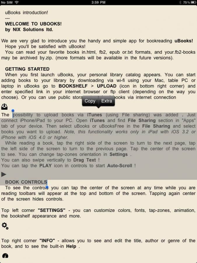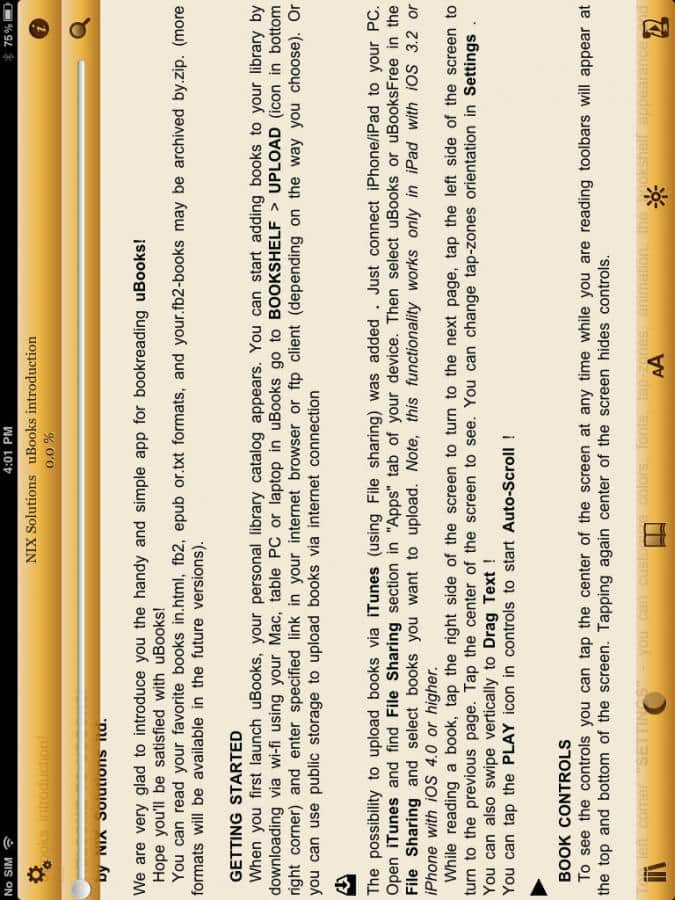 uBooks – şimdi iOS işletim sistemine sahip telefonunuzda rahat bir kitap okuyucu. Bu uygulama, gözleriniz için en rahat ve konforlu ekranı, tüm kitaplarınızın yer alacağı ilginç ve benzersiz bir kitap rafını ve ayrıca kitap ve belgeleri Wi-Fi veya FTP istemcisi aracılığıyla kolayca yükleme imkanı sunar. Bu uygulamayı kullanarak arka plan rengini, yazı tipi boyutunu, yazı tipi türünü, rahat kaydırmayı ve bu uygulamada mevcut olan daha birçok parametreyi değiştirme seçeneklerinin tadını çıkarabilirsiniz. Kitap okumak için bu uygulamayı kullanarak, olanaklarını ve ayarlarını tam anlamıyla takdir edeceksiniz.