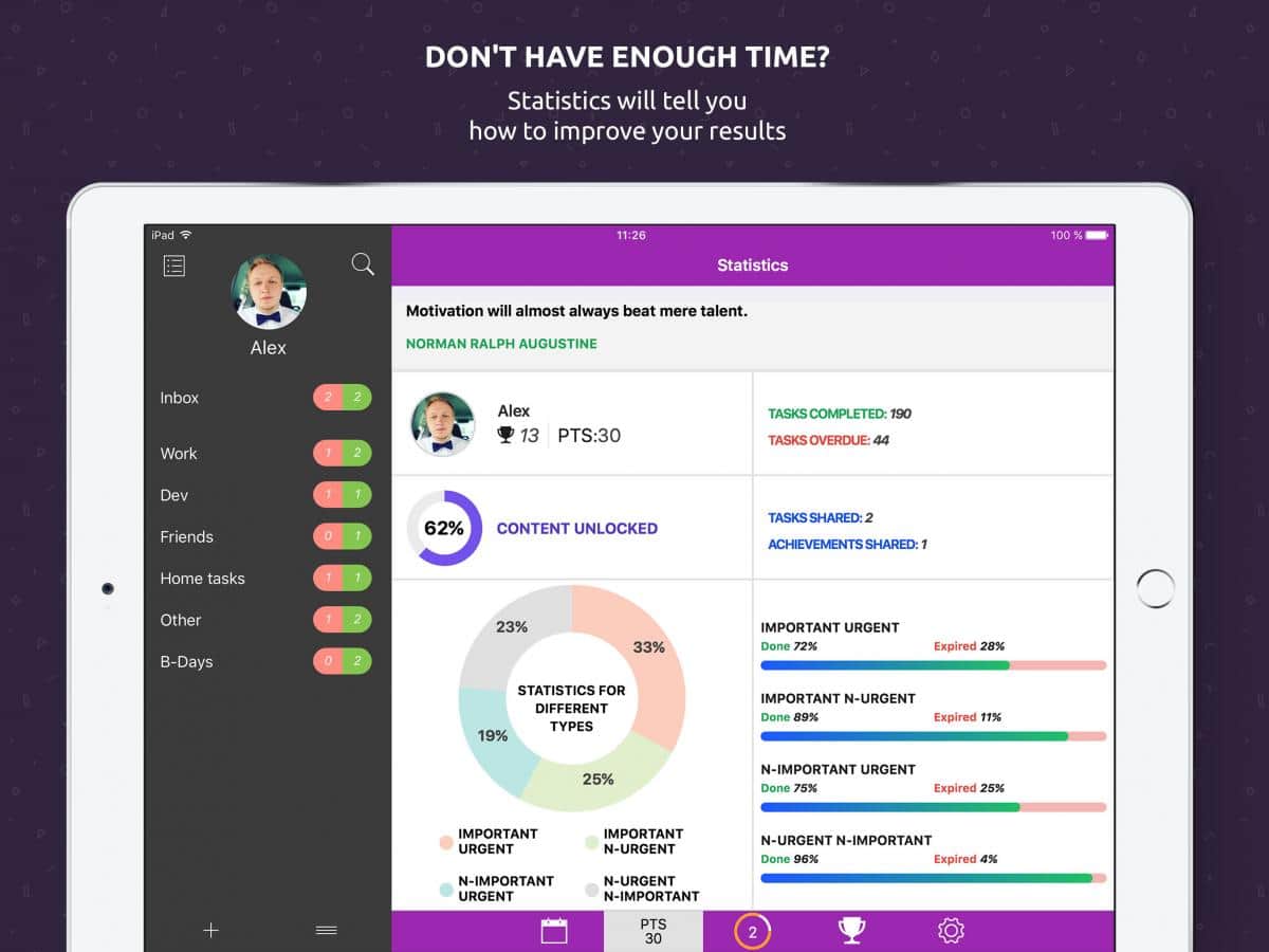 UpTask - Gün, hafta, ay için görev planlamada yeni bir yaklaşımdır. Bu uygulama, benzerlerinden köklü bir şekilde farklıdır ve en önemli farklılıklardan biri de oyun biçiminde yapılmış olmasıdır. Sadece zamanınızı iyi bir şekilde düzenlemekle kalmayacak, aynı zamanda belirlediğiniz tüm görevleri zamanında yerine getirmeniz gerekecek; bunun için çeşitli başarılar ve puanlar kazanacaksınız, bunları daha sonra istatistiklerde görebileceksiniz.
