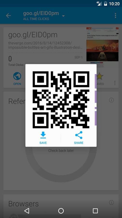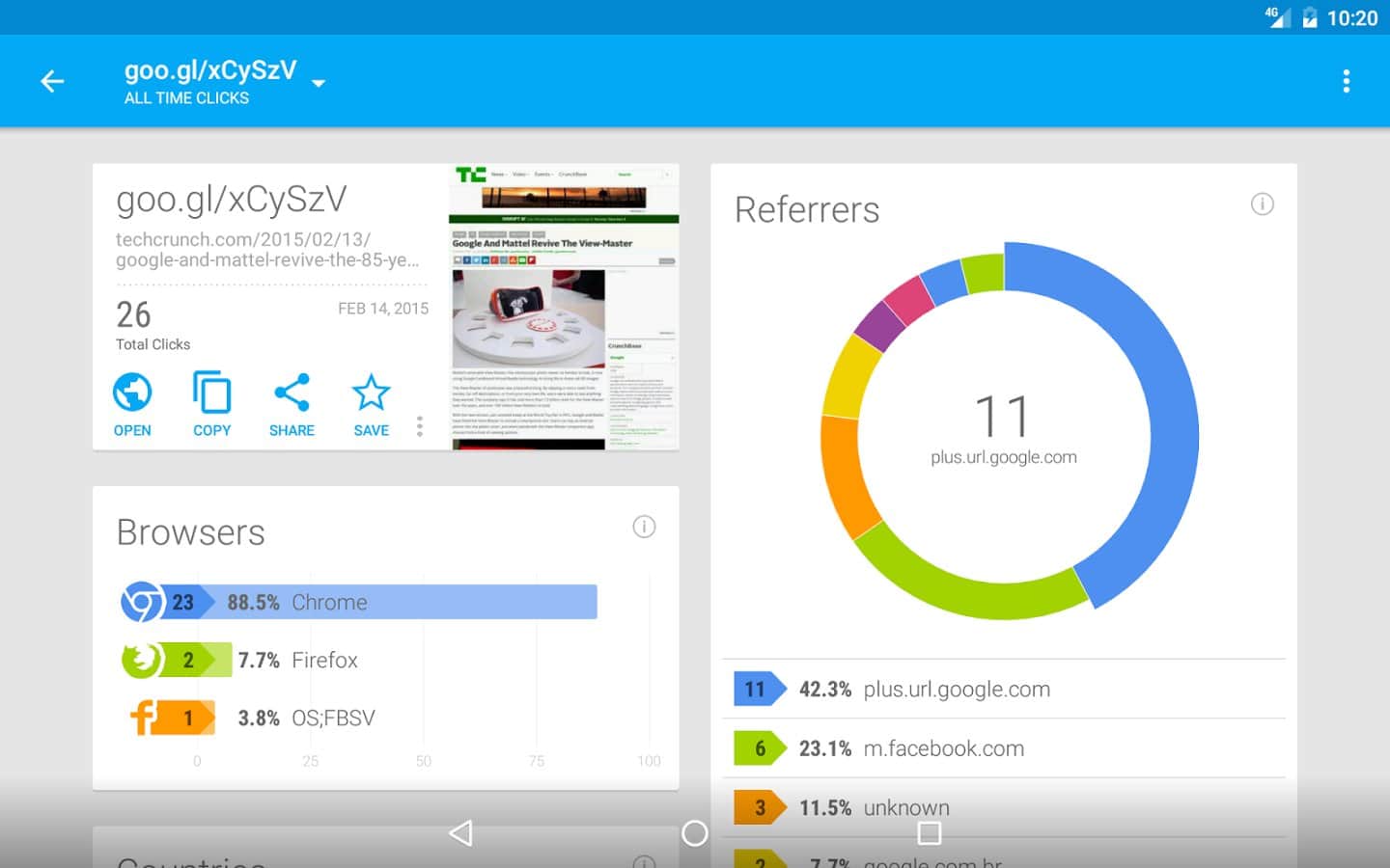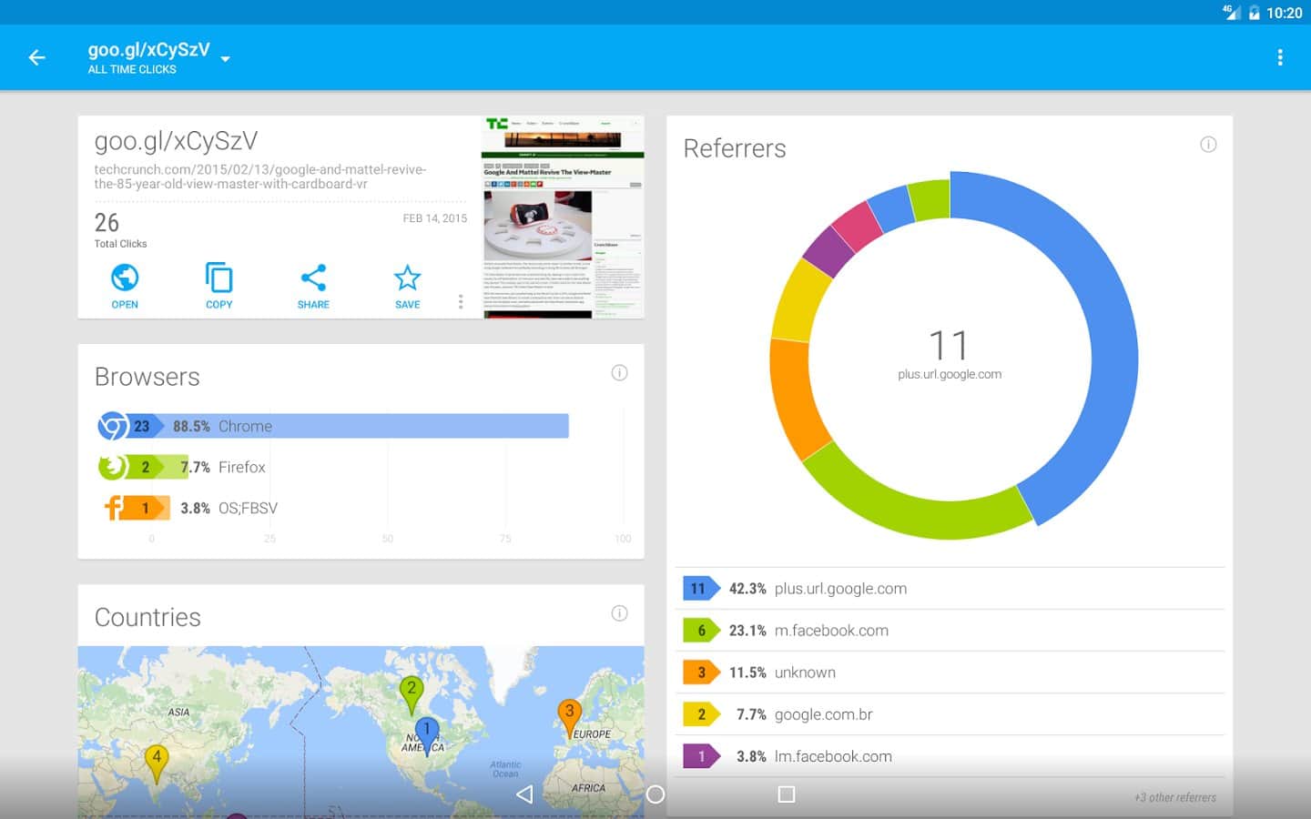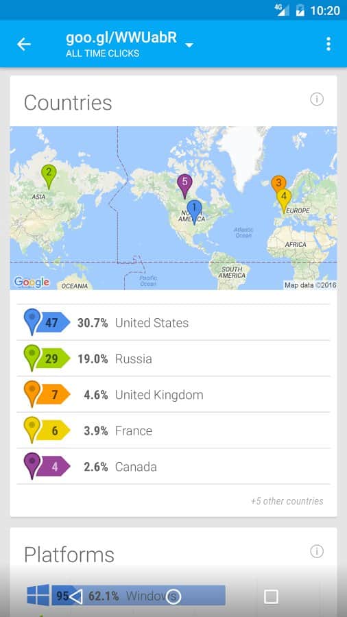 Yukarıda belirtilen bağlantılara daha makul bir görünüm verme özelliğinin yanı sıra, program her bağlantı için tıklama bilgileri, bilgilerin özellikle popüler olduğu ülkeler ve işletim sistemleri hakkında görsel analiz sunar. “goo.gl/…” formatındaki geçişlerin yanı sıra QR kodu oluşturma imkanı da bulunmaktadır.