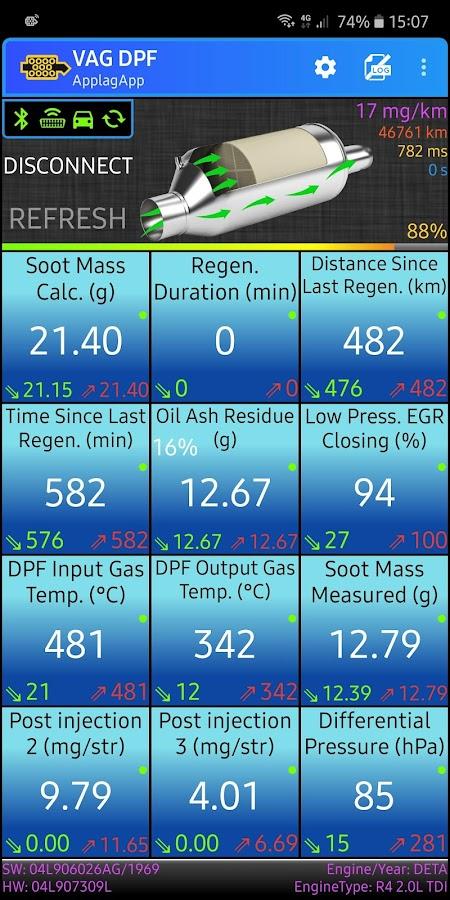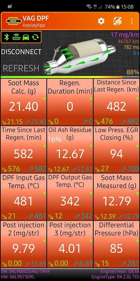VAG DPF — Audi, Volkswagen, Skoda, SEAT ve Porsche için kişisel parçacık filtresi kontrolü. Güvenilir bir ELM327 (Bluetooth/Wi-Fi) cihazını bağlayarak DPF parametrelerini gerçek zamanlı olarak izleyin: regenerasyon işlemi devam ediyor mu, başlatmayı bekliyor mu, son yakma işlemi ile aradan ne kadar km geçti, sıcaklık ve karbon oranı. Veriler CAN veriyolu üzerinden okunur, bu nedenle normal OBD2 programlarından daha fazla bilgi görürsünüz ve ayrıca Android Auto desteği de vardır.