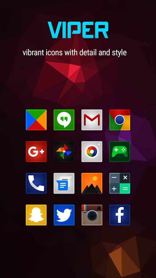 Viper İkon Paketi - Çeşitlilik ve kalite, bu uygulamanın ana sloganıdır. En iyi şekilde ve çok basit bir tarzda hazırlanmış iki binden fazla ikon içeren bir set. Hepsi kare şeklinde tasarlanmış olup, renkleri orijinalleri çok andırsa da, mükemmel bir görüntüye ve yüksek çözünürlüklü dokulara sahiptir. Ayrıca, bu setle birlikte, seti mükemmel bir şekilde tamamlayacak on güzel ve basit duvar kağıdı bulacaksınız.