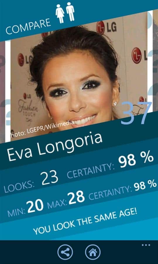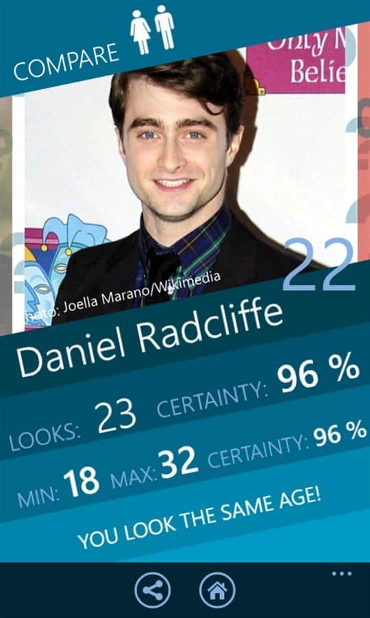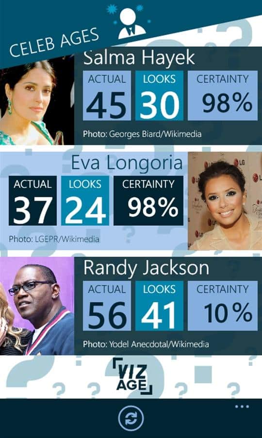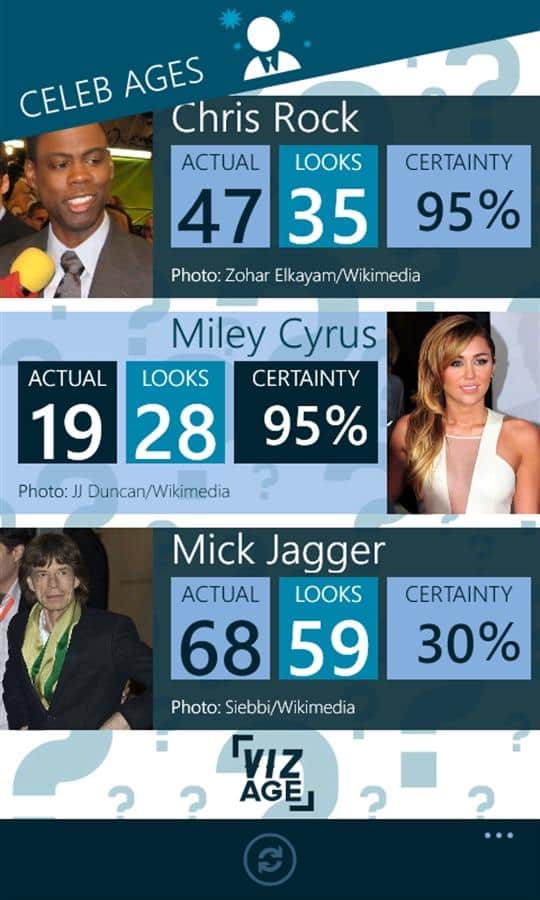 VizAge - Windows Phone için bir uygulama, bu sayede herhangi birinin yaşını kolayca tespit edebilirsiniz. Birinin yüzünün fotoğrafını çektiğinizde uygulama yaşı tahmin etmeye çalışacak, ayrıca veritabanında 300'den fazla tanınmış kişinin yaşını görebileceksiniz, favori oyuncunuzun, sunucunuzun ve müzisyenlerinizin yaşını.