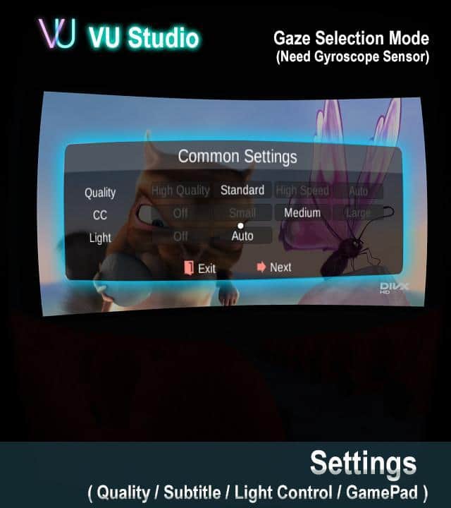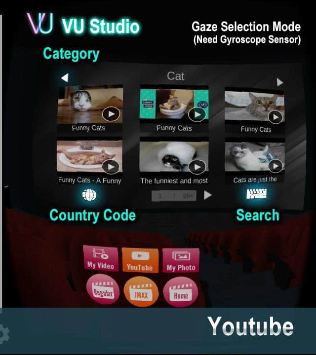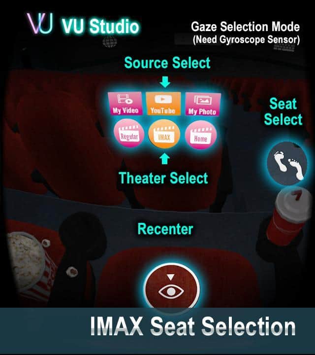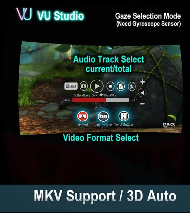 VU Sinema VR 3D Video Oynatıcı - Gerçek bir VR sineması, burada her şeyi izleyebilirsiniz! En iyi VR geleneklerinde olduğu gibi, kontrol bakışla sağlanır; ekranın ortasında bir nokta belirecek ve bu, gerekli düğmelere ve anahtarlara yönelmenize yardımcı olacaktır. Bu uygulama ile ne izleyebilirsiniz? Neredeyse her şeyi! Sıradan fotoğraflardan, YouTube'a kadar, burada akışı kaydırabilir, çeşitli videoları izleyebilir ve birçok ayarı değiştirebilirsiniz.