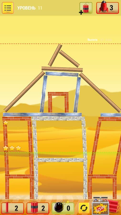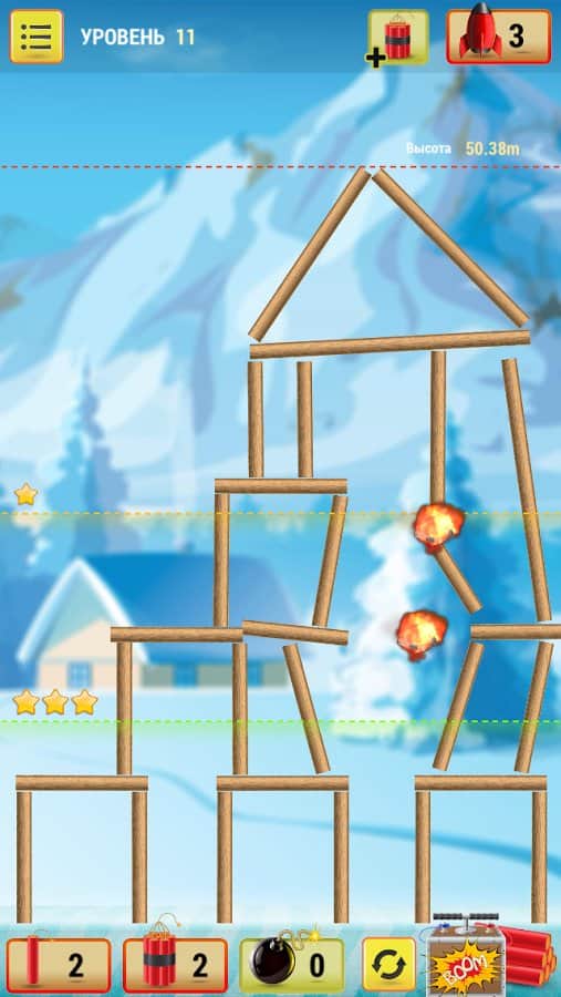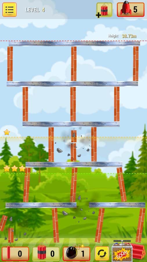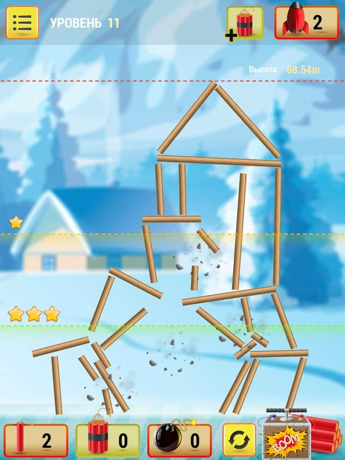 Patlayıcı / Yıkım - Android'de oynayabileceğiniz eğlenceli bir arcade oyunu olup, patlayıcı rolündesiniz. Size farklı malzemelerden yapılmış çeşitli binalar ve sınırlı miktarda patlayıcı verilecek; amacınız binayı yerle bir etmek. Her seviyede zorluk artacak; enkaza düşme açısını hesaplayarak parçaların belirlenen yere düşmesini sağlamalısınız. Farklı mekanlarda 80'den fazla seviyede binaları yıkın.