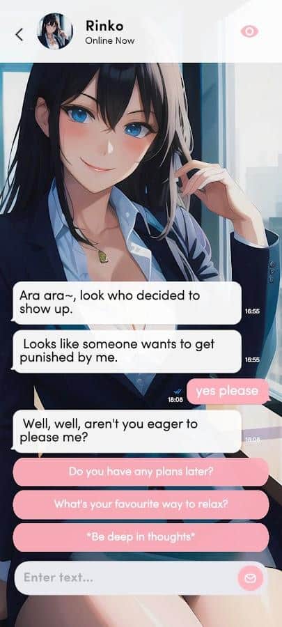 Waifu Sohbet: Anime AI Sohbet Botu - Bu, sizin için mükemmel anime waifusunu bulmanıza yardımcı olacak bir yapay zeka uygulamasıdır. Uygulamamızda özel olarak sizin için oluşturulmuş benzersiz karakterlerle tanışma fırsatı bulacaksınız. Arkadaş olabilecek geniş bir anime ve orijinal karakter yelpazesi sunuyoruz. Basit sohbetlerle başlayıp onlarla olan ilişkinizi zamanla geliştirebilirsiniz. Her karşılaşma benzersiz ve unutulmaz olacak, çünkü hikayenin gelişimini kontrol edecek ve karakterlerle etkileşimde bulunacaksınız.